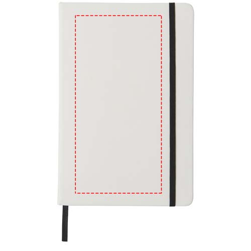 White A5 notebook with coloured elastic closure and ribbon. Includes 80 sheets (60g/m2) lined paper. Digital print possible on cover.