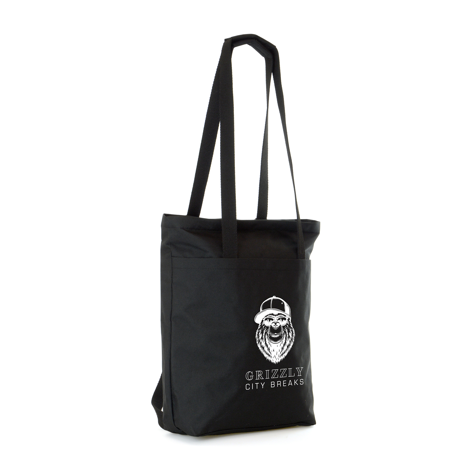 600D RPET polyester backpack with multiple pockets that converts into a long handled shopper. Adjustable woven handles with padded shoulder strap.