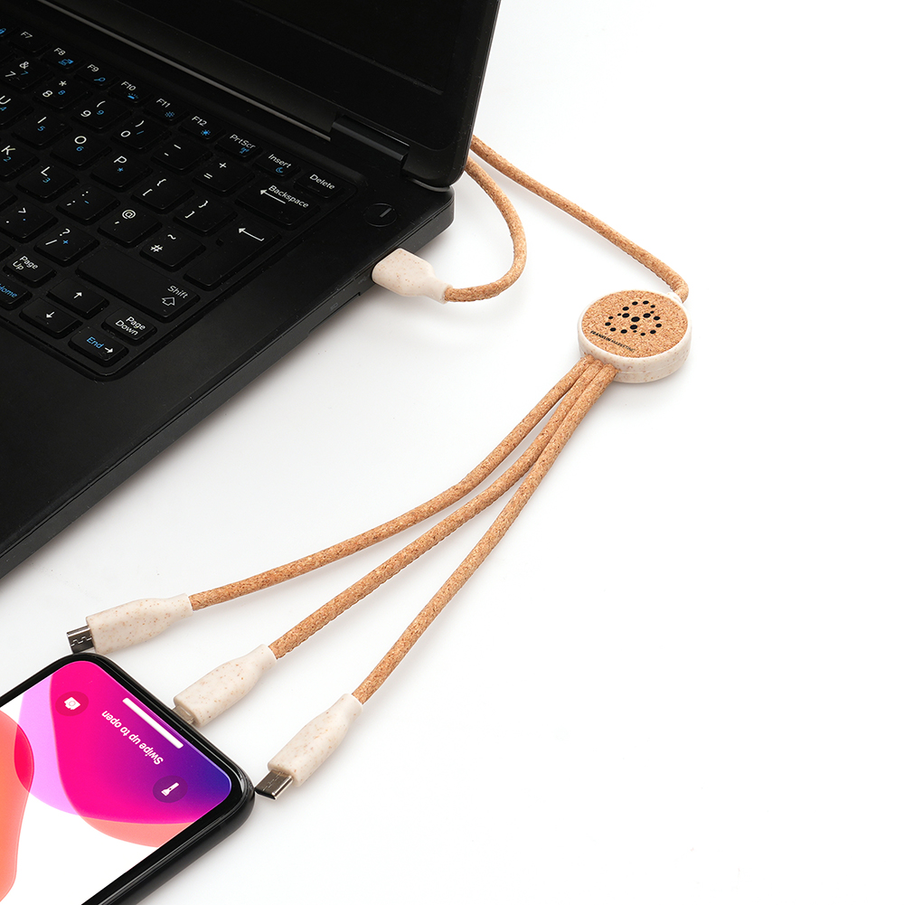 Cork cable charger with wheat USB connection and a 3-in-1 type C connector, 5 pin connector (iPhone) and micro USB (android) connector.