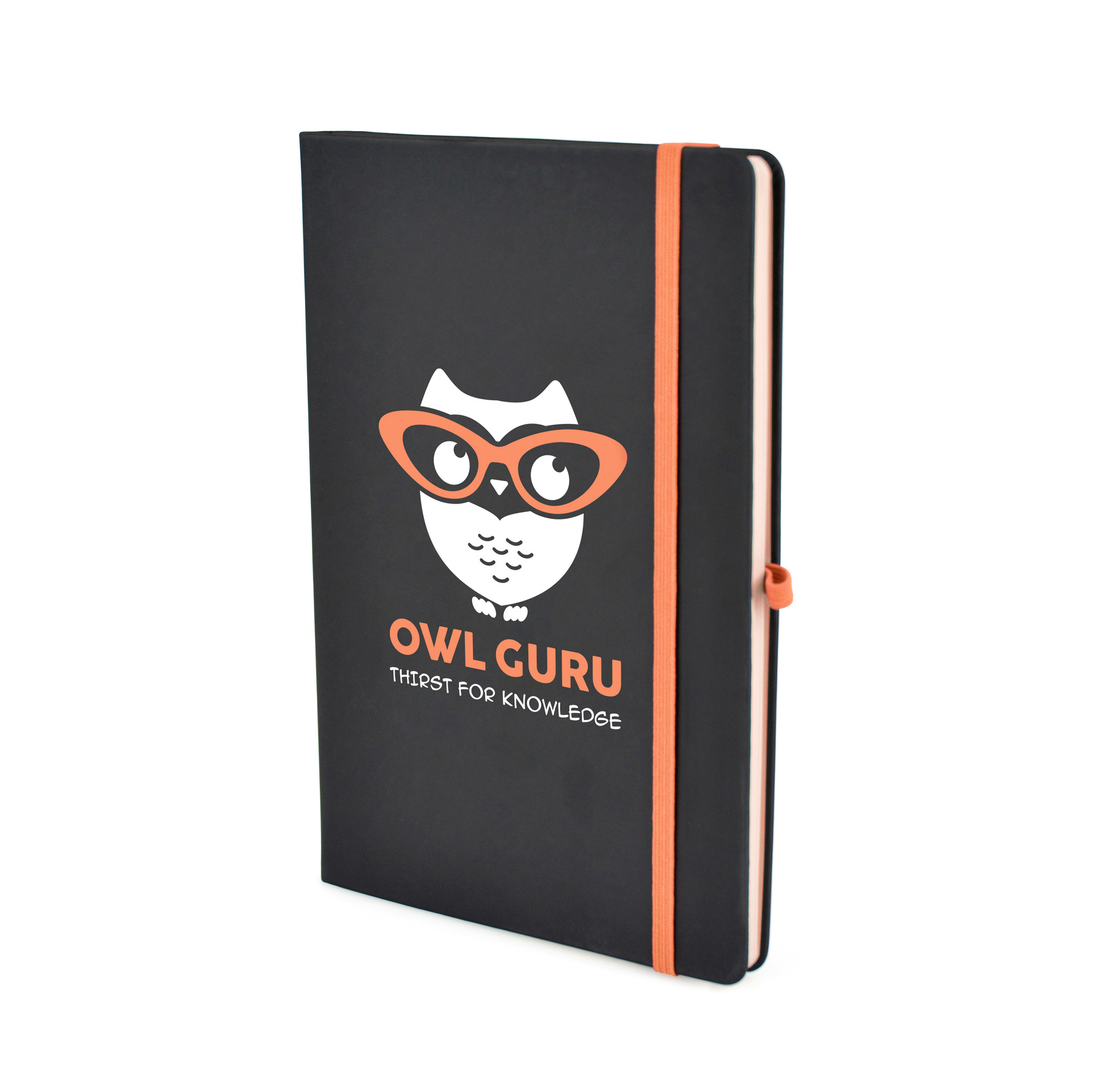 A5 black PU soft finish 80 cream sheet lined notebook with coloured bookmark, heavy duty card back pocket for securing business cards and loose notes, coloured elastic pen loop and coloured elastic closure.