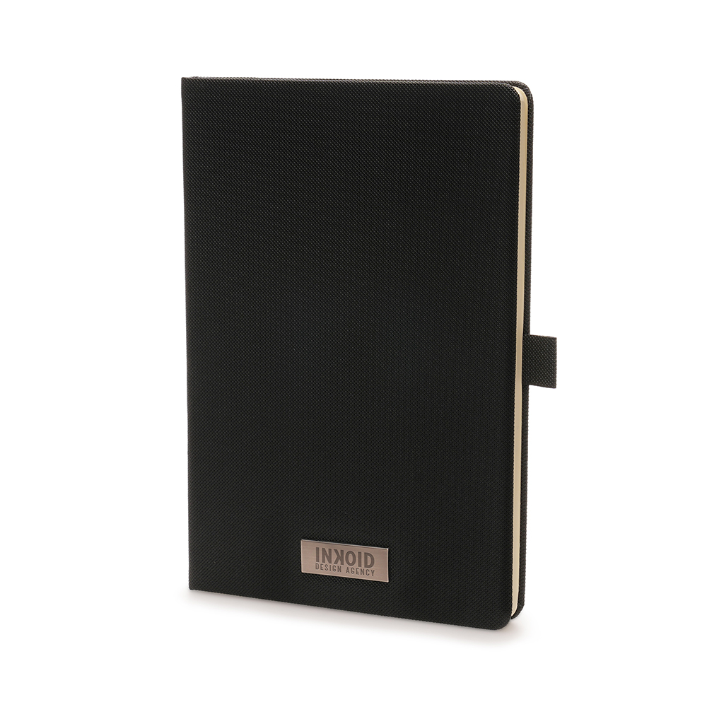 RPET wrapped notebook with PU cover made from recycled polyester and metal plate for engraving. Featuring 80 lined sheets of recycled cream paper, ribbon bookmark and pen loop.