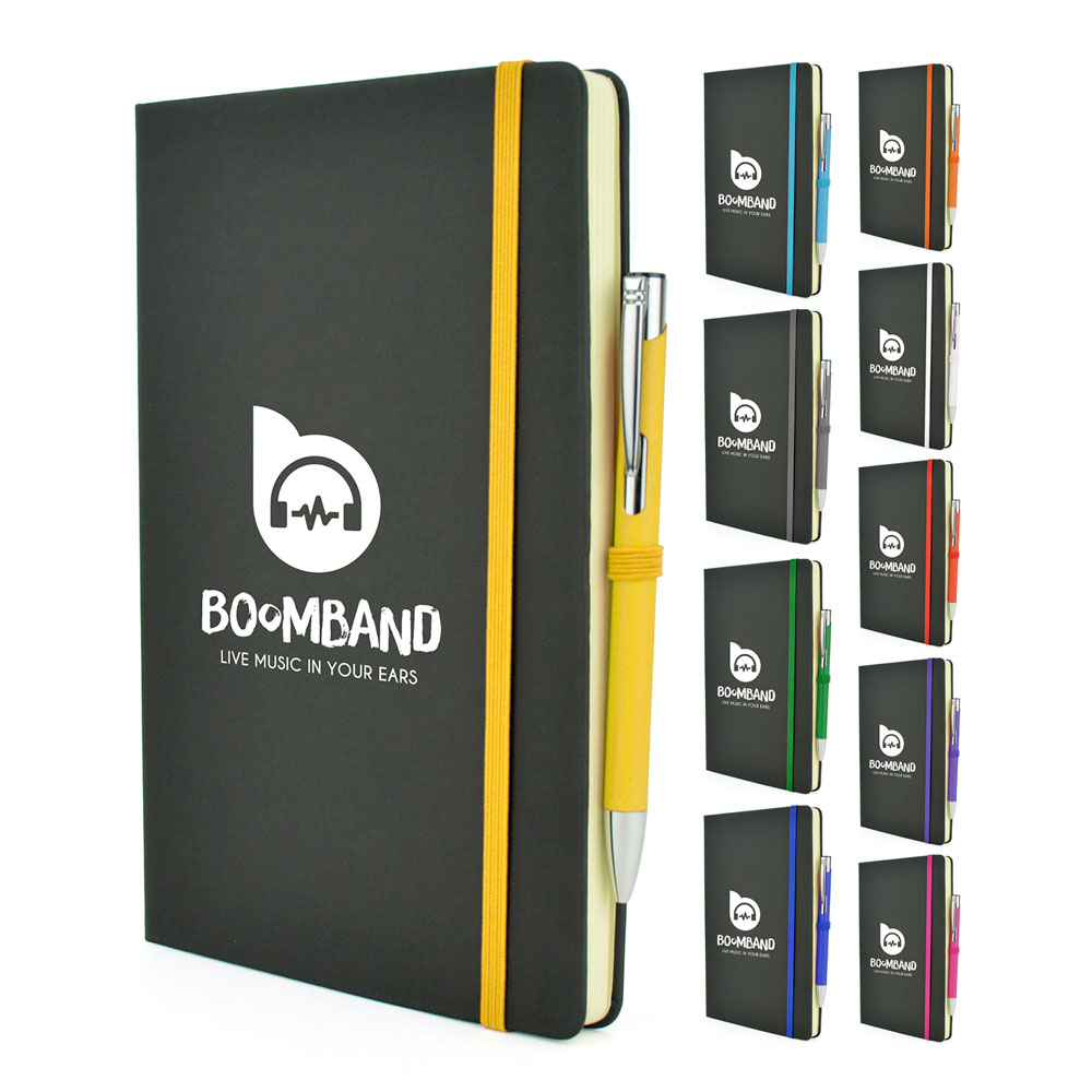 2-in-1 A5 black PU soft finish notebook with a matching Mole Mate Ball Pen. The notebook features 80 lined sheets, coloured pen loop, back pocket, coloured ribbon bookmark and coloured elasticated closure.
