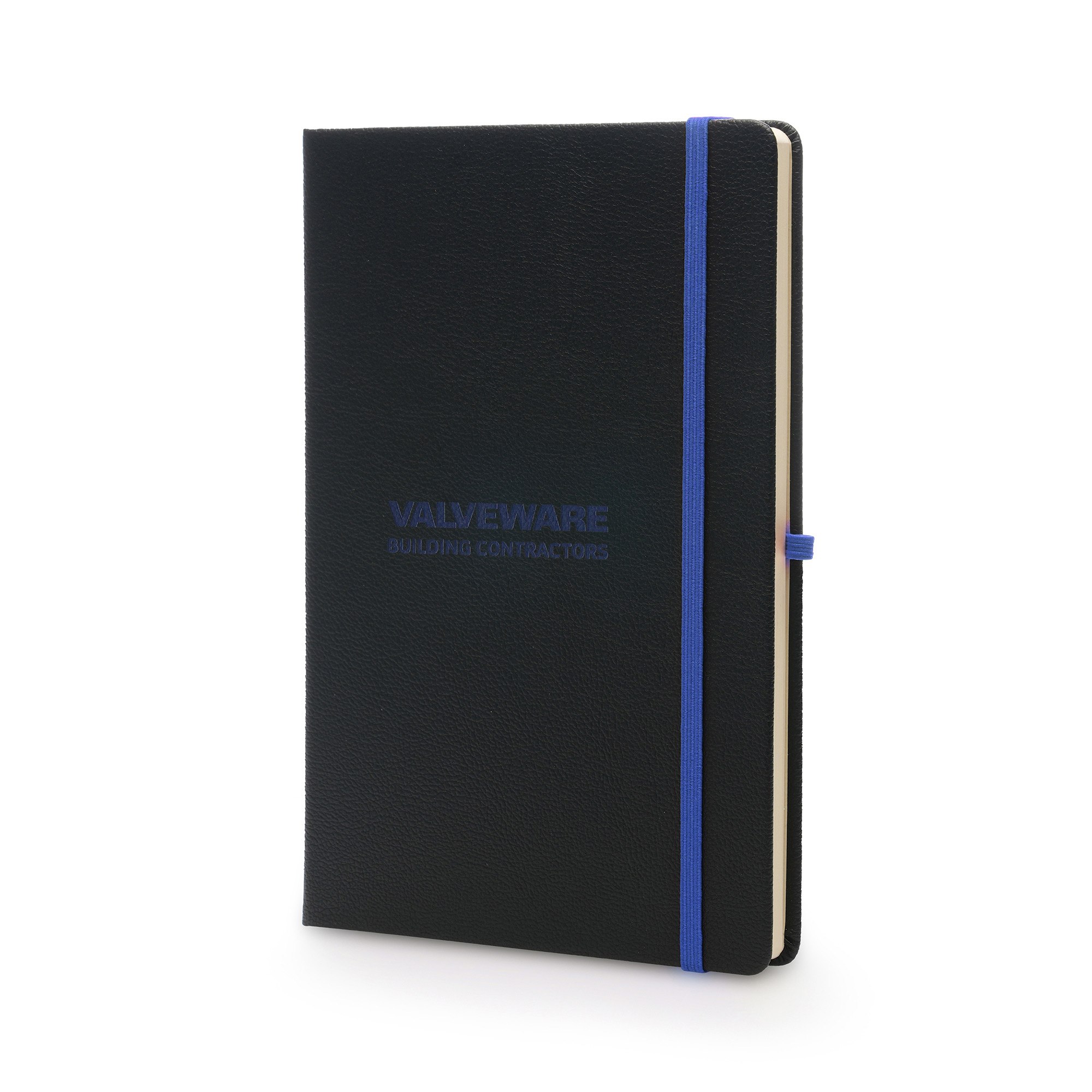 80 lined sheet notebook made from recycled materials. Your logo is engraved to reveal a coloured undercoat. With coloured ribbon bookmark, elastic pen loop and elastic closure.