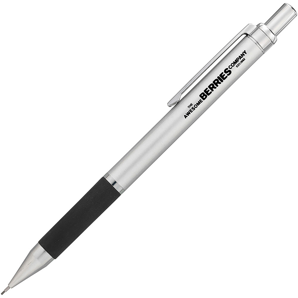 A metal barrelled 0.7mm 2B pencil with integral eraser, spare lead and comfort grip. Lead is retractable.