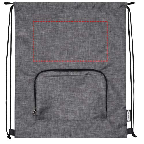 The Ash foldable recycled drawstring bag features a main compartment with cinch closure, and a zippered front pocket that the bag can easily fold up into for easy transport and storage.