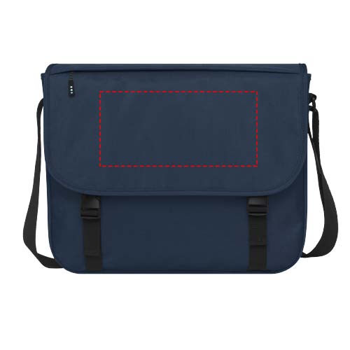 Sustainable GRS certified RPET laptop bag made with 60% recycled materials. Features a large zippered main compartment with a padded 15" laptop sleeve and a front compartment (both with velcro closures). Comes with a cover flap with a zippered pocket and with buckle closure. Features comfortable padded and adjustable shoulder strap and trolley tunnel on the backside.