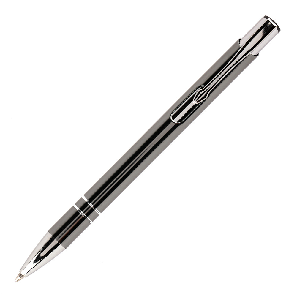 A metal push action ball pen in a well-known design with a blue ink refill that can be printed or engraved.