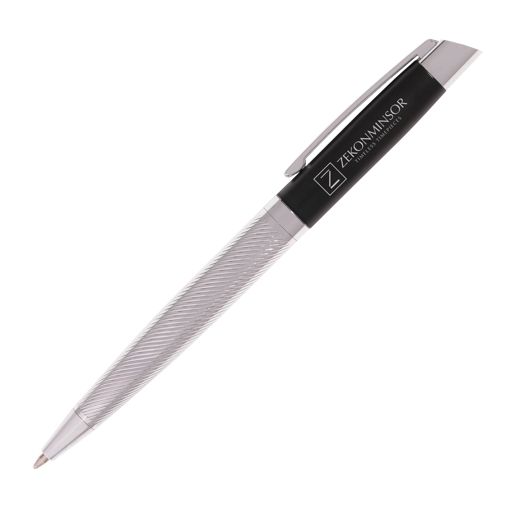 A metal twist action ball pen with a uniquely textured barrel that appears to spiral around the bottom half of the barrel in a striking chrome finish. The contrasting top section of the pen is finished in satin smooth black coating that can be engraved to produce a stunning chrome logo design or message.
