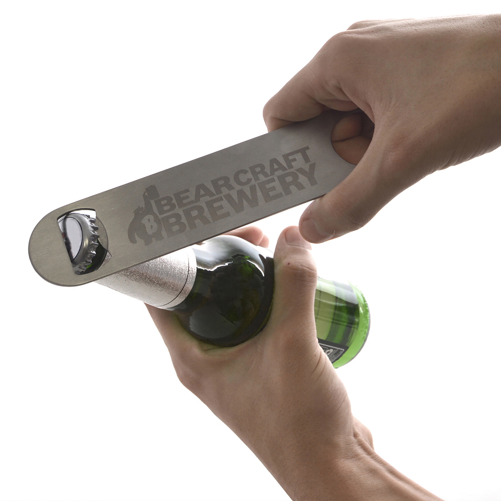 Flat metal bottle opener with rounded edges Available in 2 colours