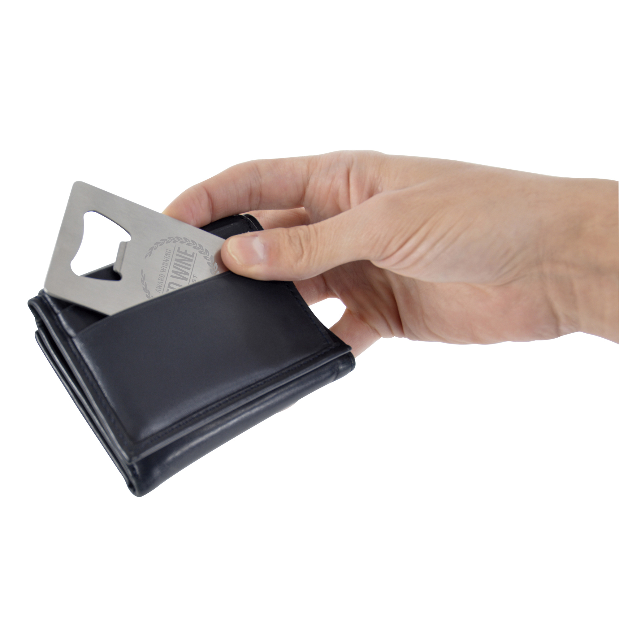 Brushed metal credit card shaped bottle opener. Compact and easy to carry, you can put the bottle opener in your wallet or on your keychain and you'll never need to look for a bottle opener again.