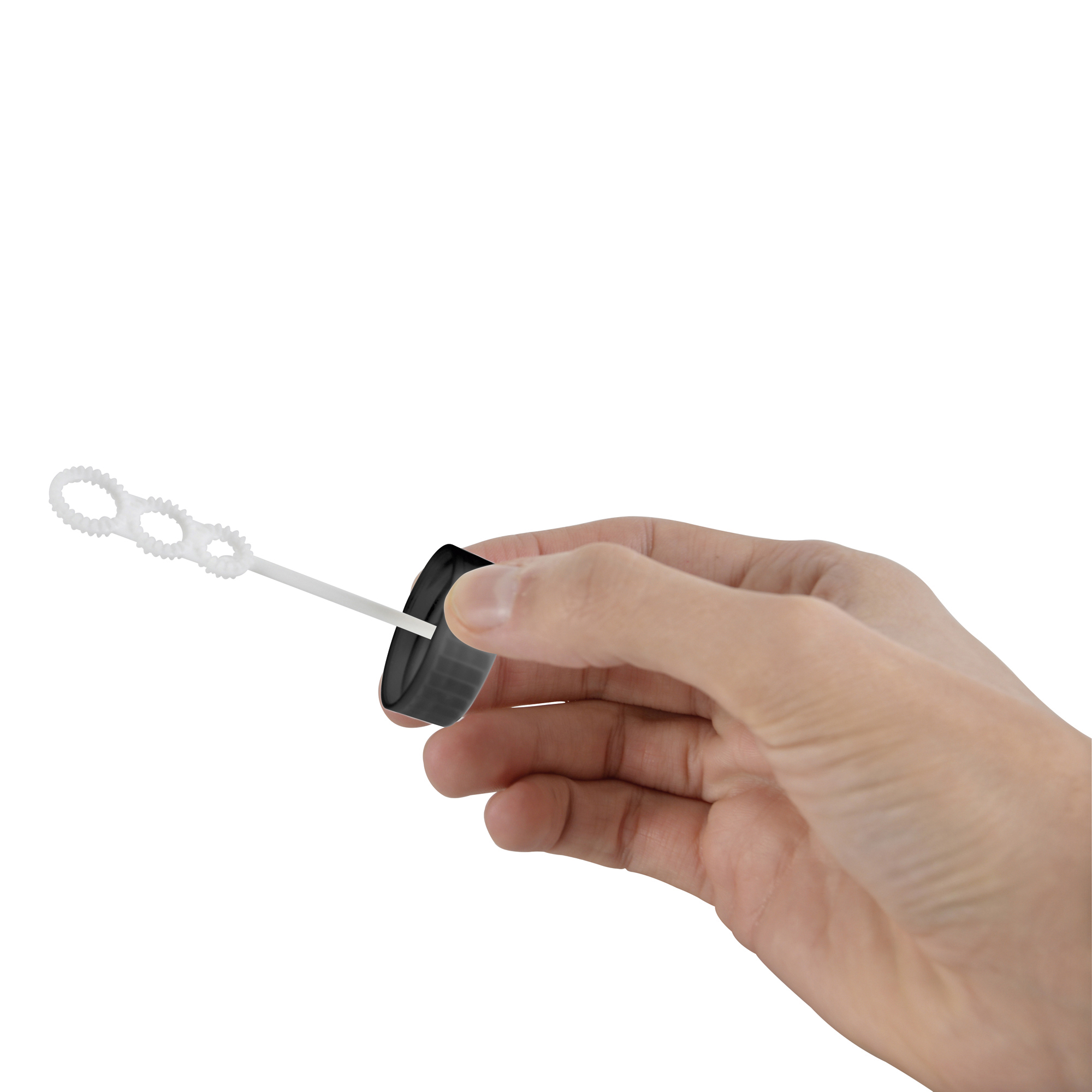 60ml white soap bubble blower bottle with 3-in-1 bubble wand attached to the black screw top lid. A fun promo idea for kids, wedding favours, festivals and other outdoor events.