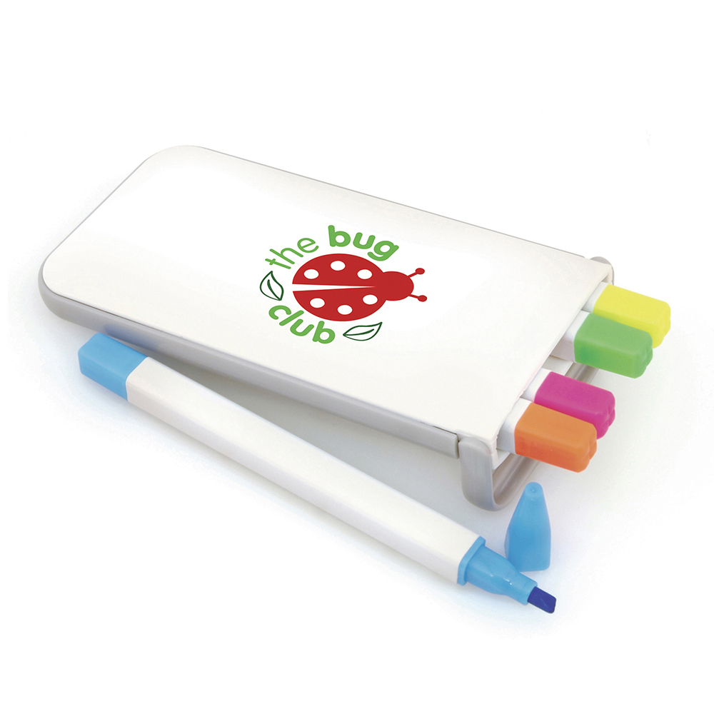 Rectangular cased 5 piece highlighter set with highlighters in yellow, green, blue, pink and orange. Available in 1 colour