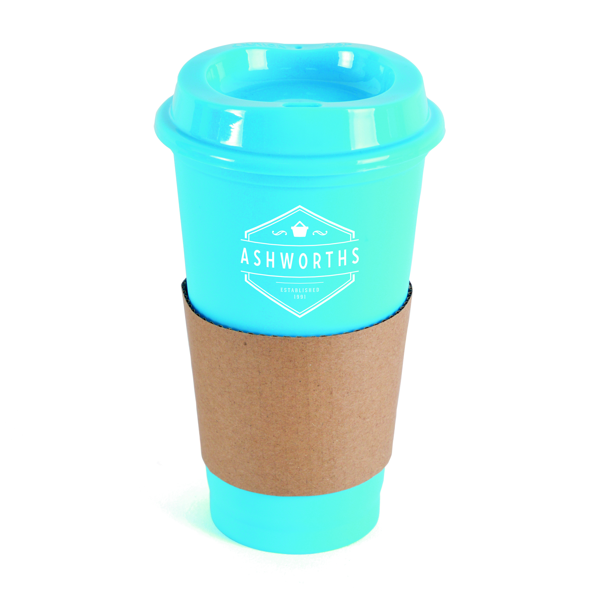 500ml single walled PP plastic take out style coffee mug. Coloured matching lid supplied with brown cardboard sleeve. BPA & PVC free. Available in 10 colours