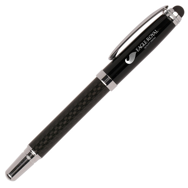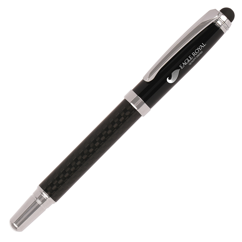 A high quality rollerball pen with a high grade carbon fibre barrel. Features a stylus that is perfect for using on touch screen devices. The barrel can be printed, whilst the cap can be engraved to show a mirror-chrome finish.
