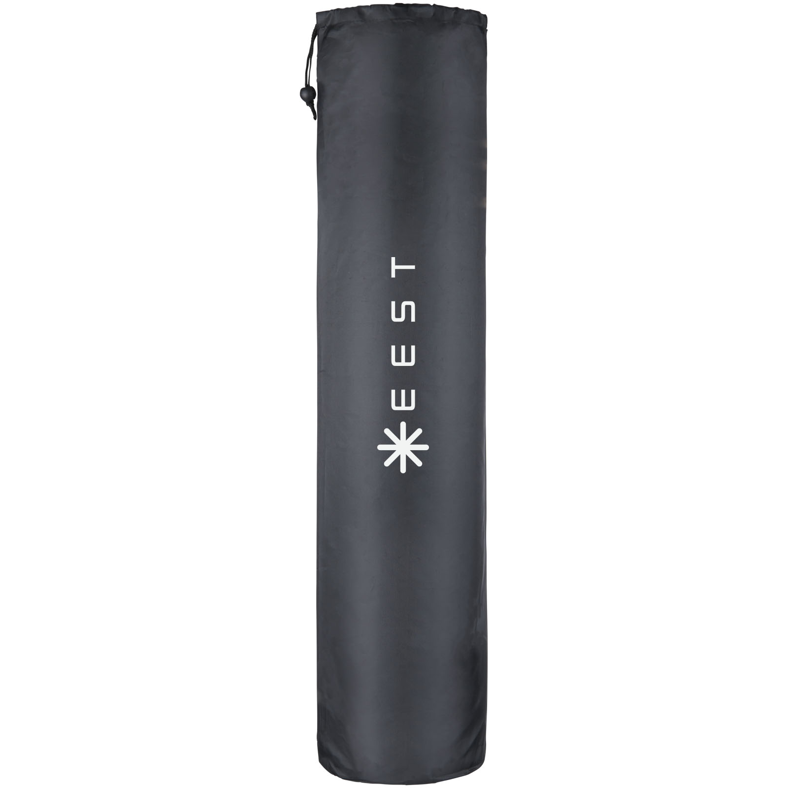 Comfortable yoga and fitness mat with diamond pattern and non-slip surface. Includes polyester carrying pouch with drawstring closure and adjustable shoulder strap. Mat size: 60x170x0.5cm.