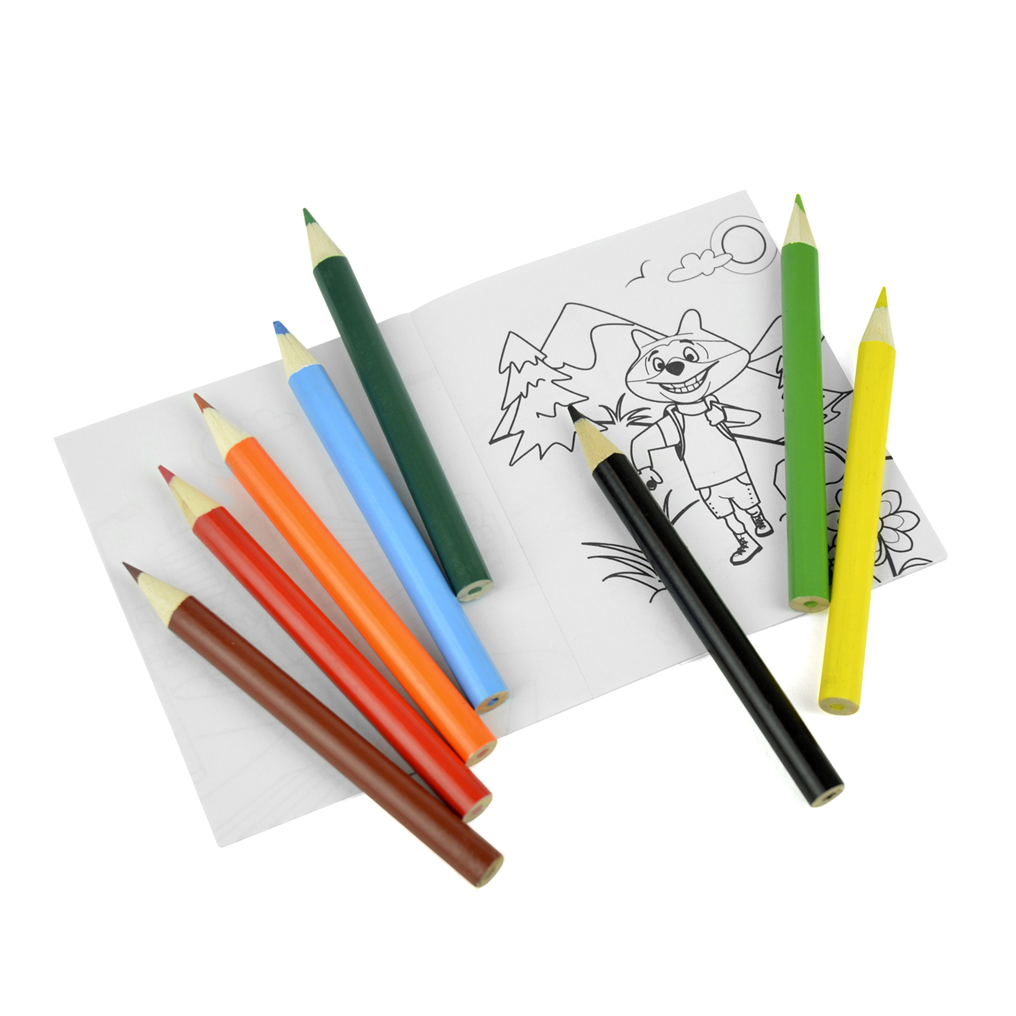 8 piece colouring pencil set with picture colouring pad housed in a plastic case. Coloured pencils in yellow, orange, blue, light green, dark green, red, brown and black. An ideal giveaway for children and schools.