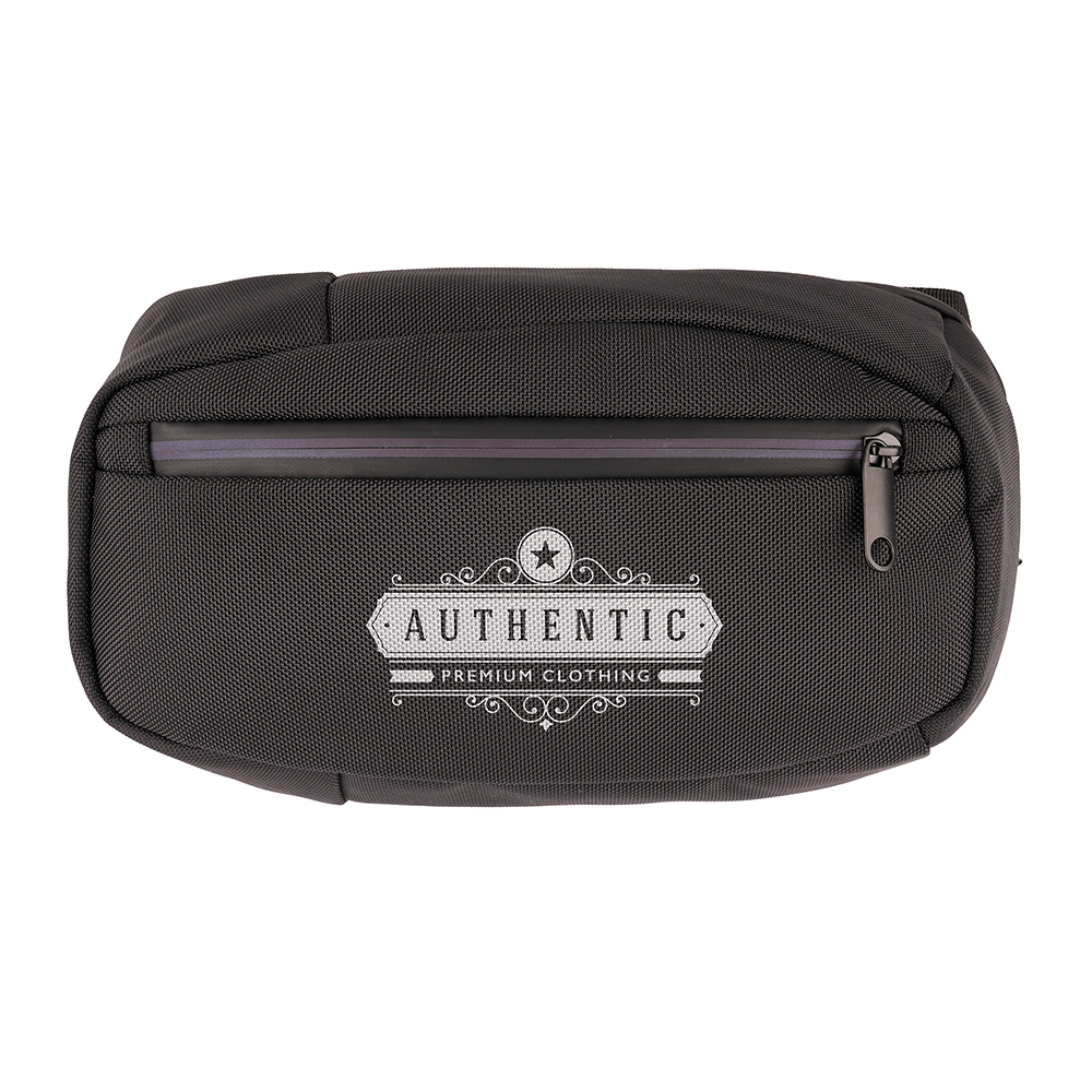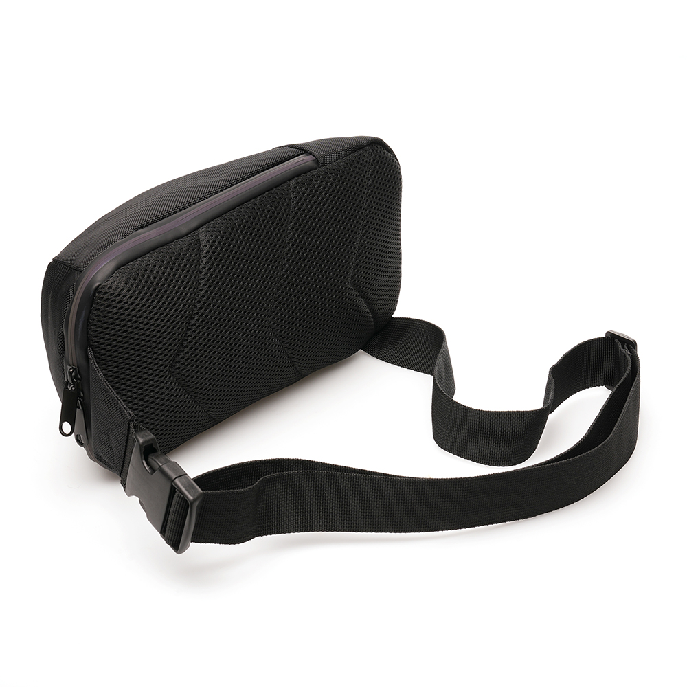 RPET cross chest bag with coloured reflective zippers, pocket to front and main compartments. Adjustable cross chest strap with buckle and padded webbed backing for easy carrying.