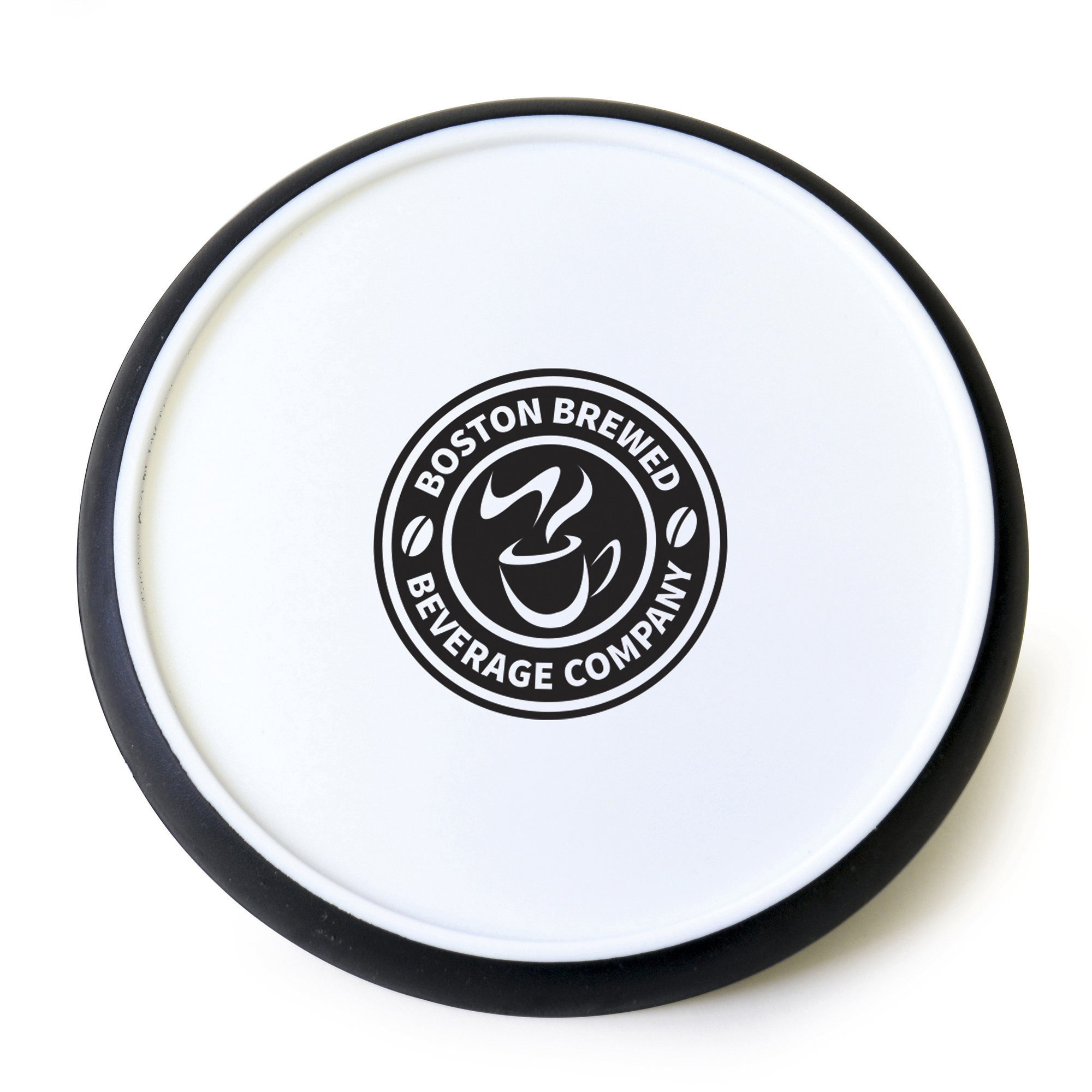 Circular white plastic coaster with coloured silicone edge for a better grip. Available in 2 colours