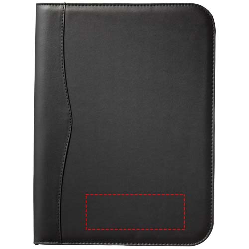 The perfect item with which every employee indirectly contributes to greater awareness of every brand: the Ebony portfolio. The A4-sized portfolio includes a handy compartment plus a zipper pocket for storing documents. Next to this, it has a 20-pages lined notepad plus a pen loop (pen and accessories not included). Close the portfolio with the zipper to keep the contents neat and well protected. The portfolio is made of durable imitation leather and offers plenty of space for large logos.