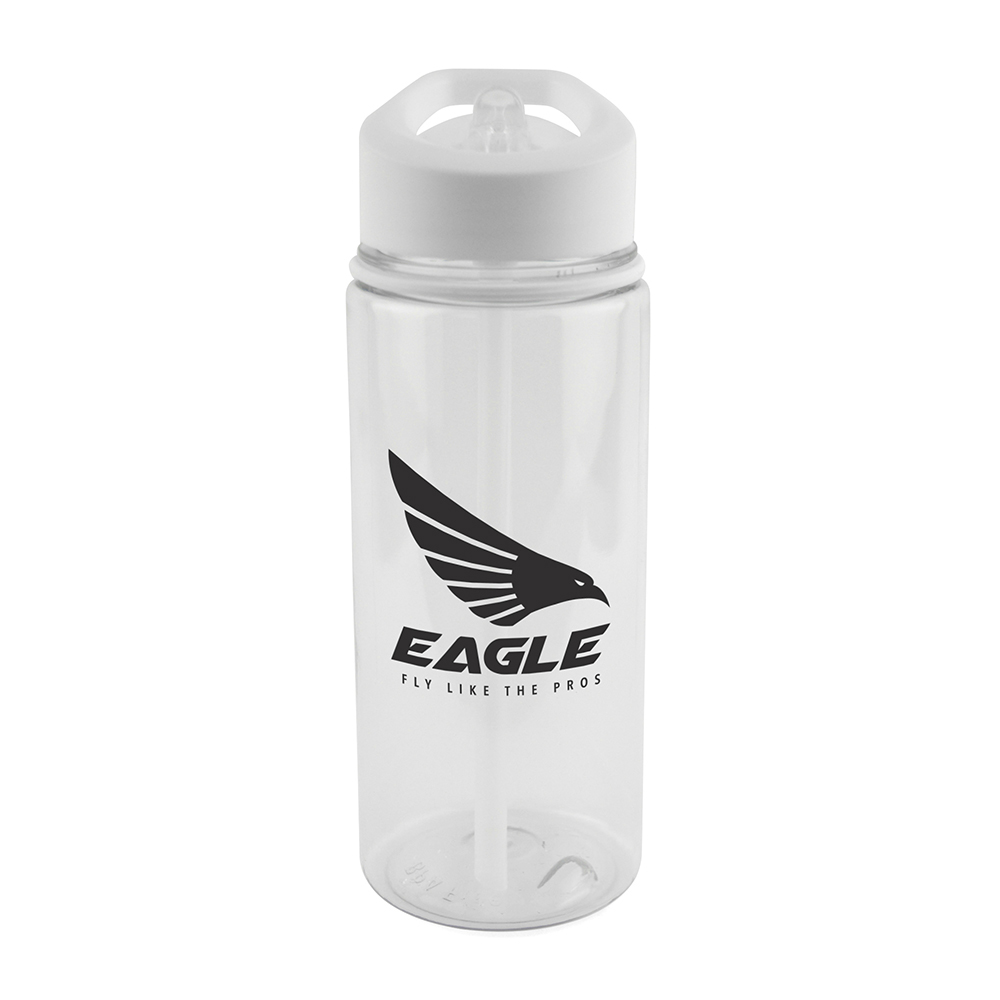 550ml single walled PET plastic transparent drinks bottle with clear PE plastic straw, fold down AS plastic sip mouthpiece, coloured PP secure screw top lid. BPA & PVC free. Available in 3 colours