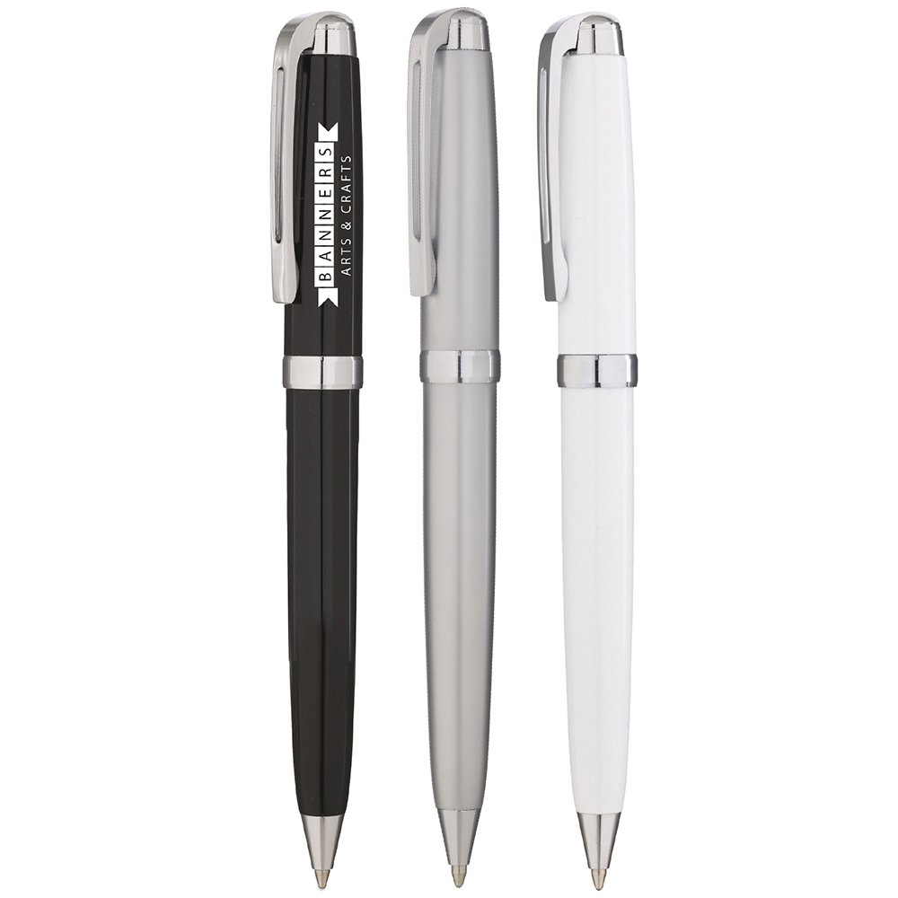 A well balanced, twist action ball pen with a hinged clip. Supplied on its own or as a set with the matching roller. Black version engraves chrome (at an additional cost).
