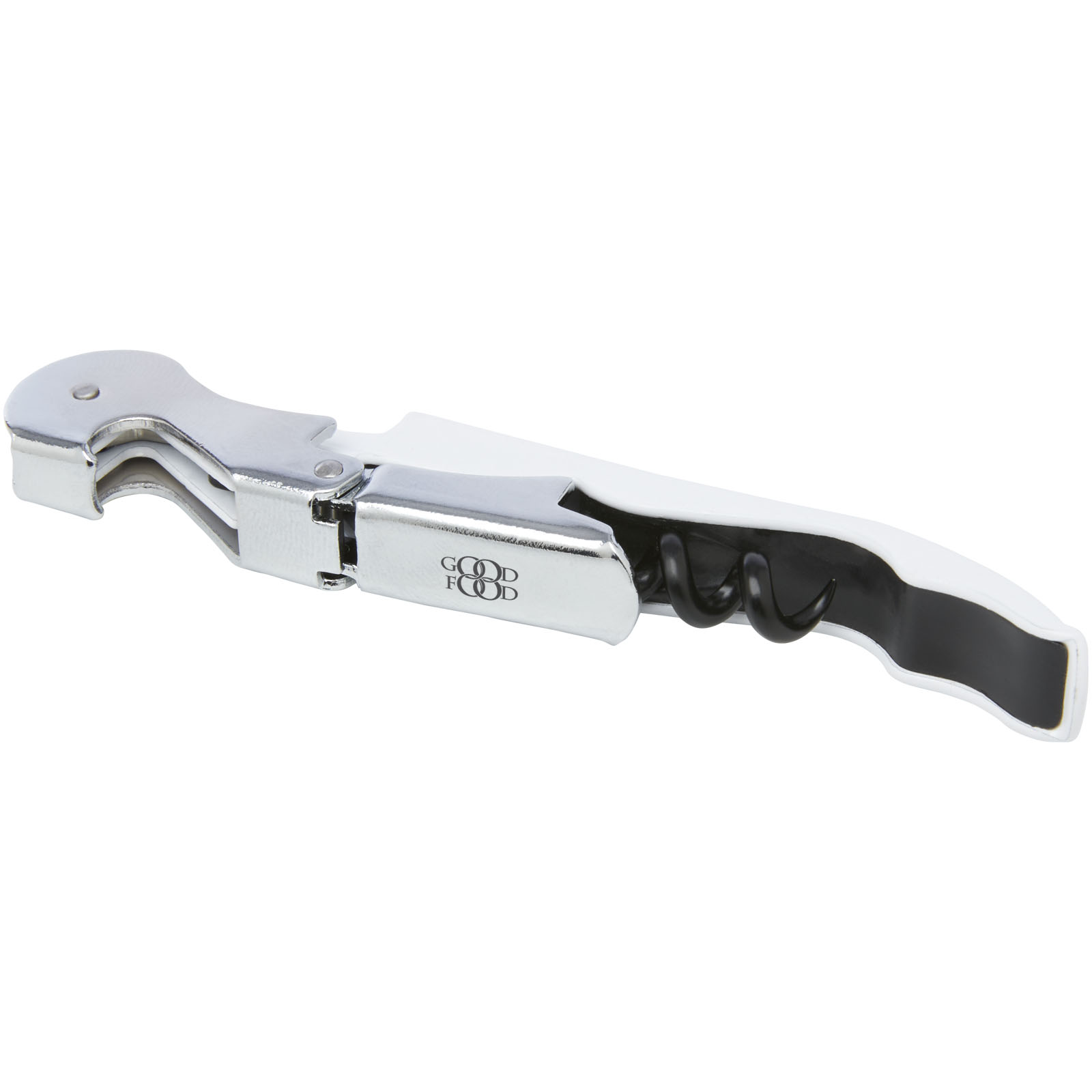Stainless steel waitress knife with a colored body featuring a corkscrew, foil cutter, and bottle opener. With the two-step construction it's easy to pull the cork out from the bottle.