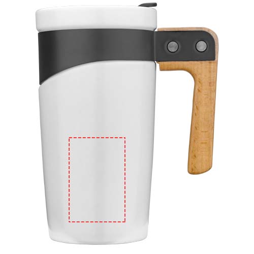 A must-have ceramic tumbler. Matte finish body and natural wooden handle are combined by the black coated stainless steel band. Push-on, slide lock lid included. Volume capacity is 475ml. Presented in a gift box.