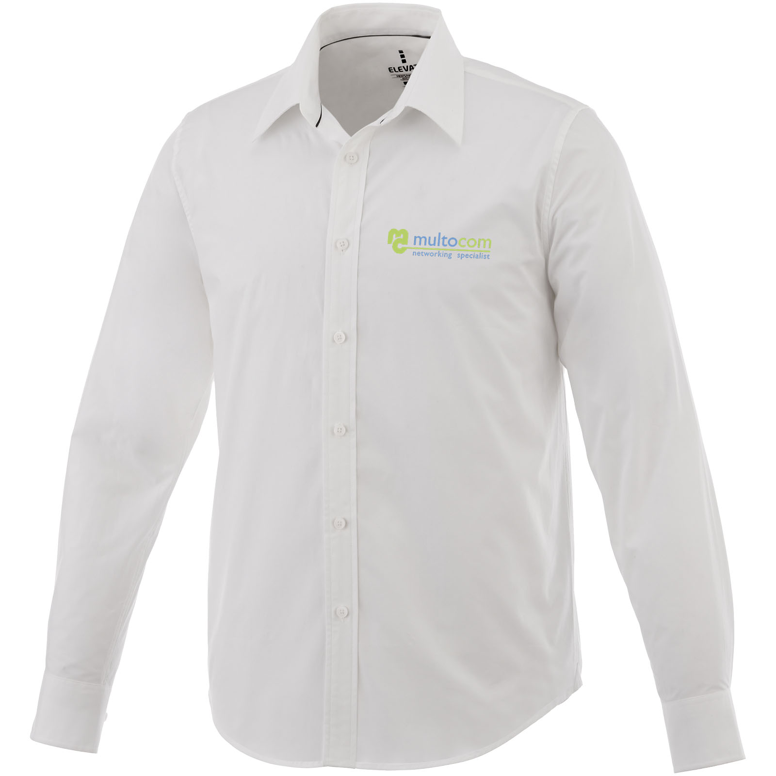 The Hamell long sleeve men's stretch shirt – an ideal combination of style and comfort. This woven shirt features a lightweight poplin fabric of 97% cotton and 3% elastane. Poplin fabric is known for its tight weave, which provides exceptional durability while maintaining a soft and smooth texture against the skin. This means that the Hamell shirt is not only comfortable to wear but also resistant to everyday wear and tear, ensuring long-lasting use. The added stretch provides ultimate freedom of movement, ensuring optimal comfort throughout the day even more. Its hidden button-down collar adds sophistication while maintaining a clean look.