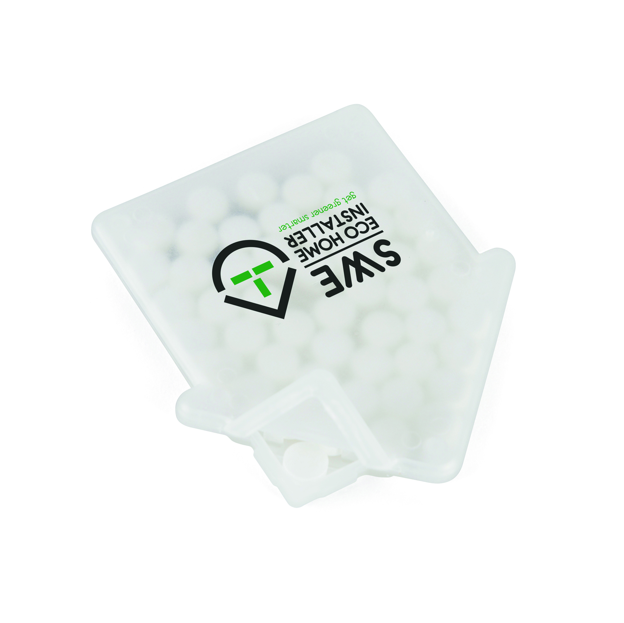 Plastic house shaped mint card with approx. 50 sugar free European mints(8g). Available in 1 colour