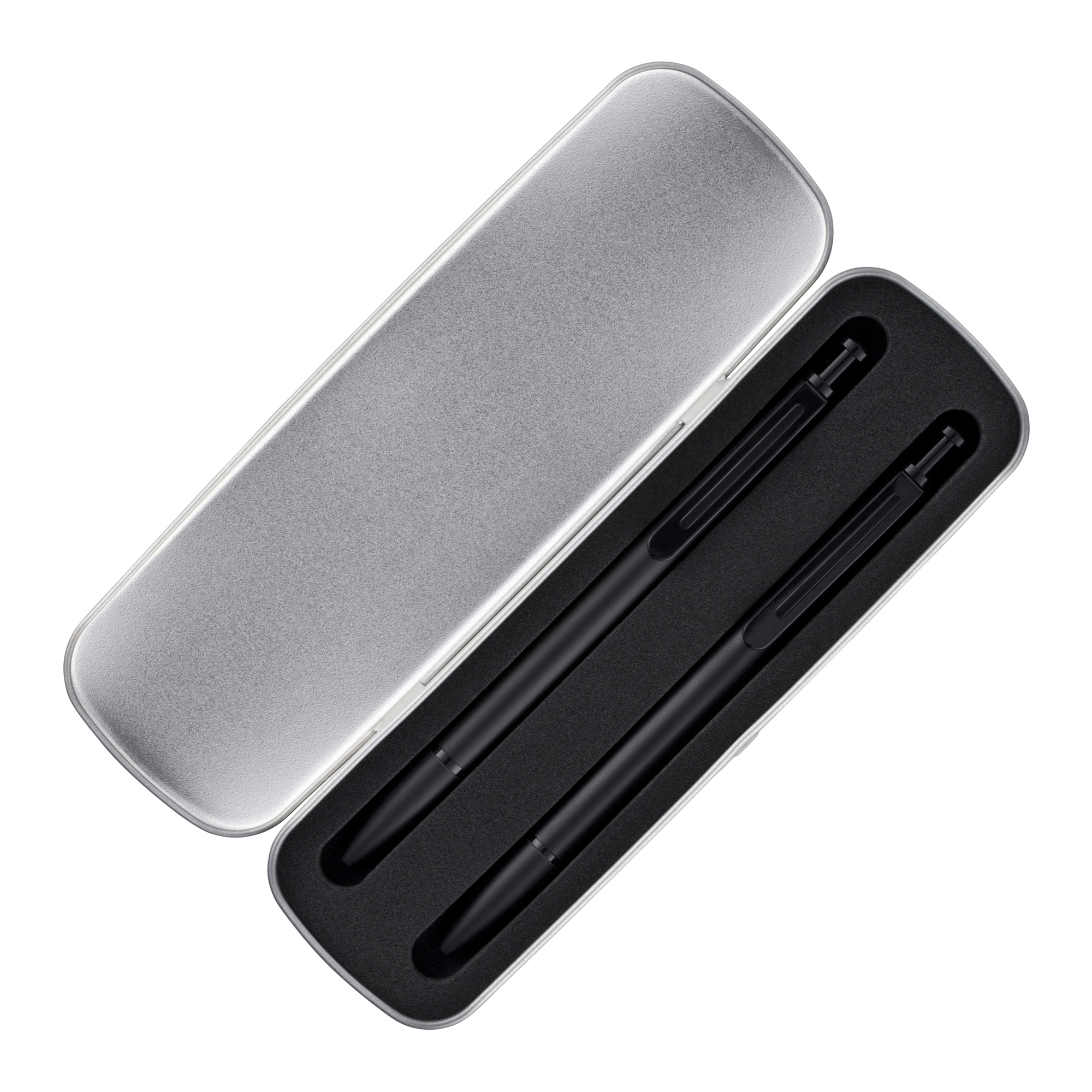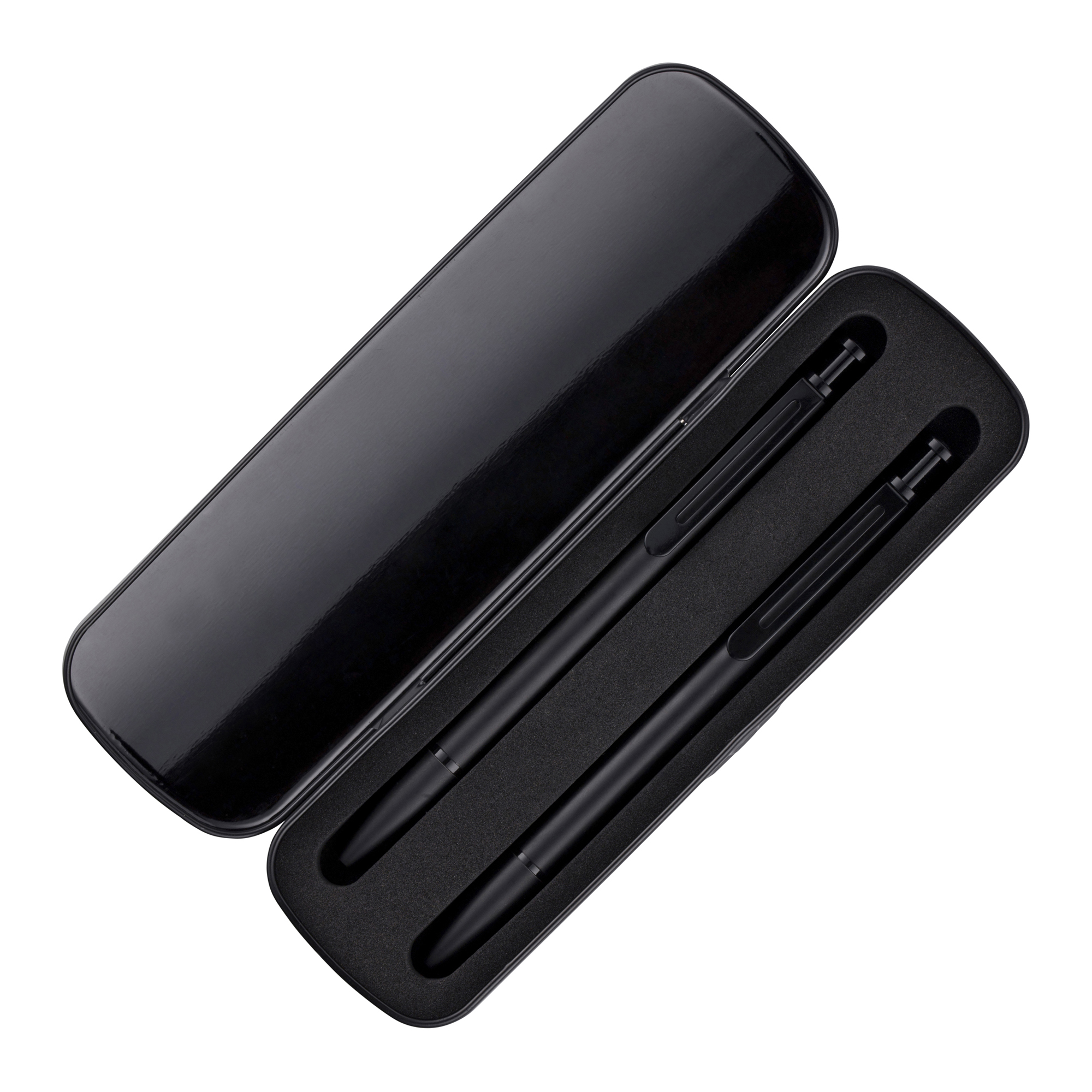 A pen set that oozes modernity with a Hurst ball pen and 0.7mm pencil (available in black or white), supplied in a shapely metal box. The box is available in silver or black. Prices are based on both writing instruments being personalised with the same design/colour.