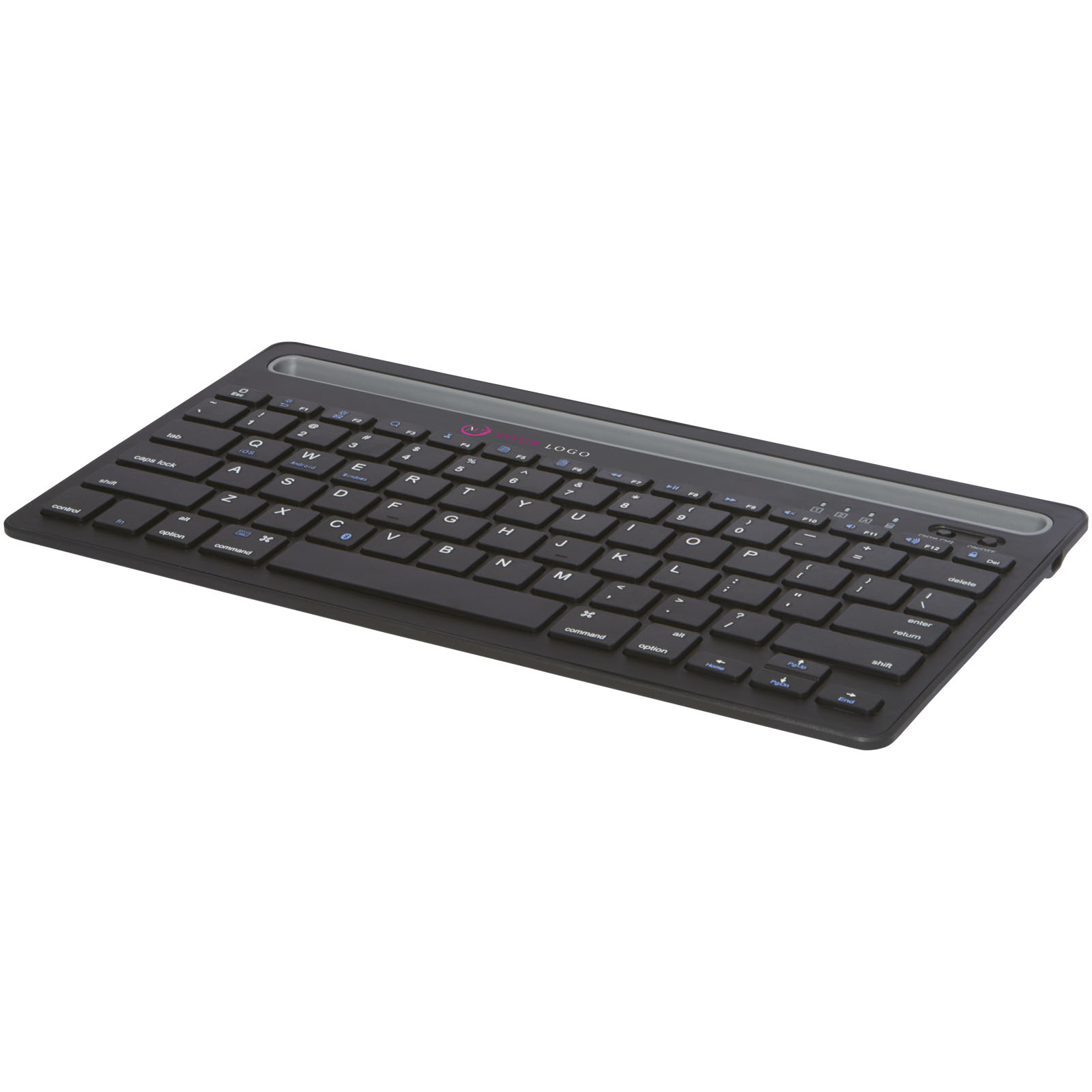 Compact QWERTY keyboard with 78 keys. Bluetooth® 3.0 with dual channel support so that it can connect with two devices simultaneously. Integrated docking stand for a phone and tablet. The keyboard is compatible with PC/laptop, tablets, mobile phones, smart TVs and other devices with Bluetooth® function. The operating distance is up to 10 meters. The 150mAh built-in rechargable battery provides at least 40 hours of usage, or up to 6 months on standby. Charging takes approximately 3 hours. Delivered in a premium kraft paper box with a colourful sticker.