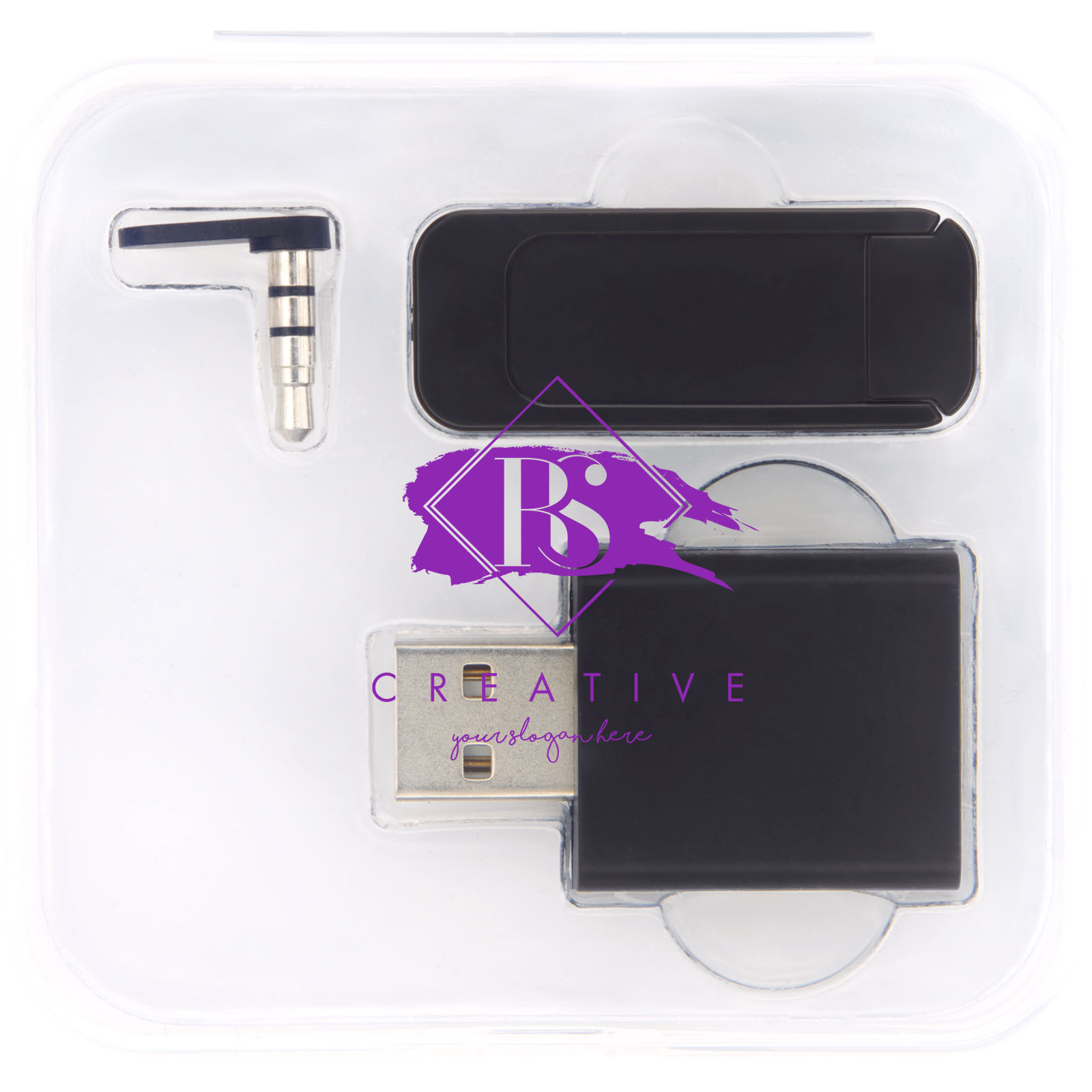 Digital privacy kit including a USB data blocker, a webcam blocker, and an audio jack blocker. The USB data protector prevents accidental data exchange when connecting a mobile device to a computer or public charging station. The item will block any data transfer while the device is being charged, preventing data from being stolen or malware being installed. The webcam blocker can be attached in front of the laptop webcam to block any unwanted access to the the webcam. The audio jack blocker can be placed in the AUX port of the device to avoid third parties listening in to conversations. Delivered in a protective box.