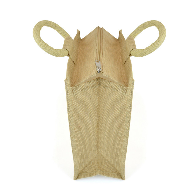Natural laminated jute bag with zipper for top closure and jute loop padded handles.