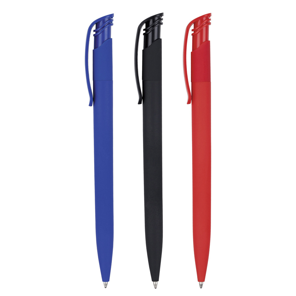 A deluxe version of our best selling push action plastic pen. A soft feel barrel with gloss clip, branding to clip preferred, however digital print is available to barrel.