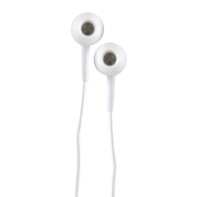 in-ear earphones with 3.5mm headphones jack with 1.3m long cord. Earphones are white and housed in a white square plastic case with transparent lid. A tidy way to store your earphones.