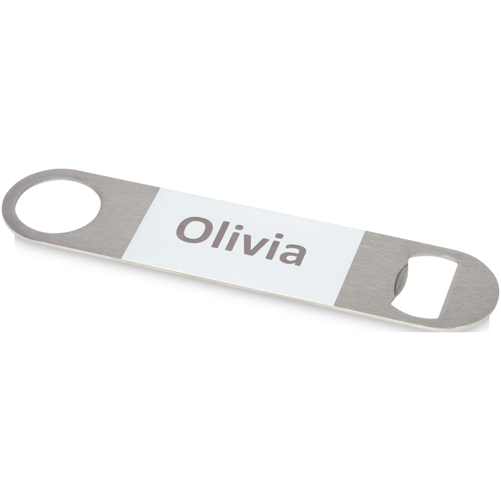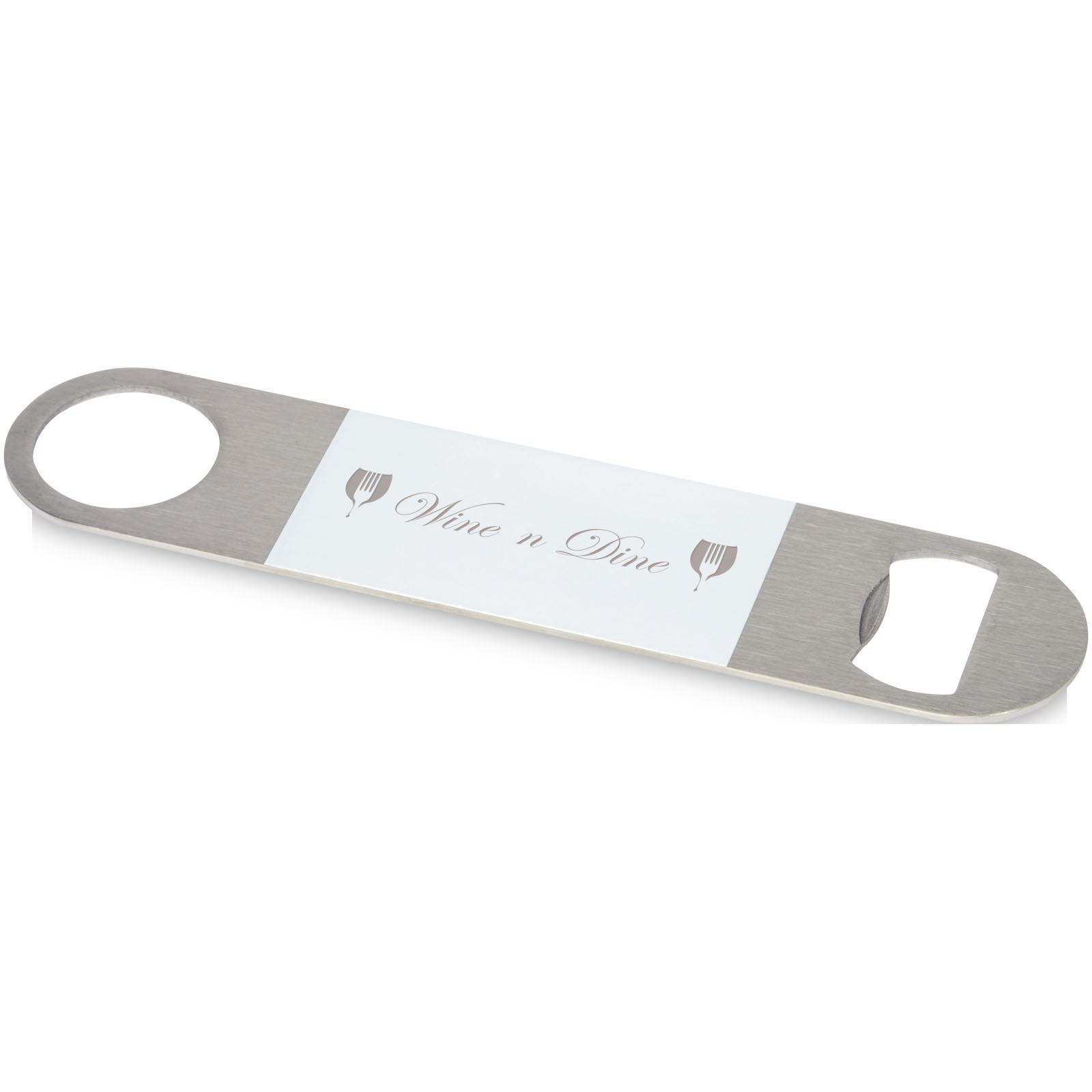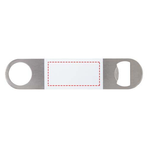 Bottle opener made of stainless steel with a large coloured area in the middle.
