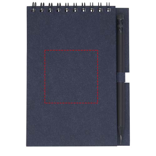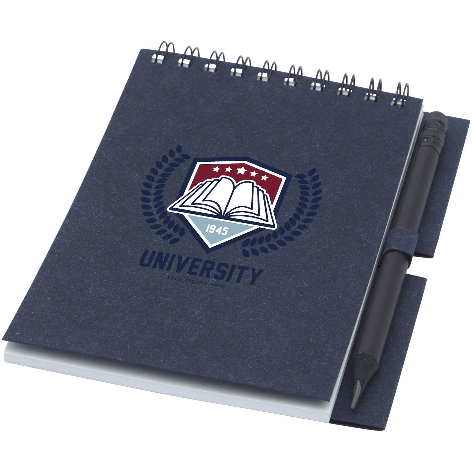Recycled paper cover wire-o notebook with 40 sheets, 80 g/m² blank FSC recycled paper, and a black pencil. The notebook is made in Italy and the pencil is made in China.