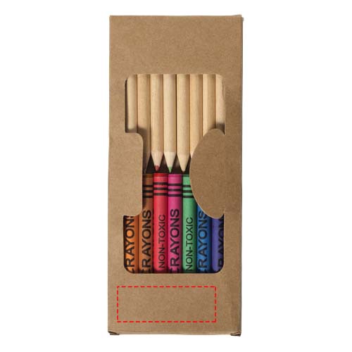 9 coloured wax crayons and 10 coloured pencils in carton box with plastic window. Decoration not available on components.