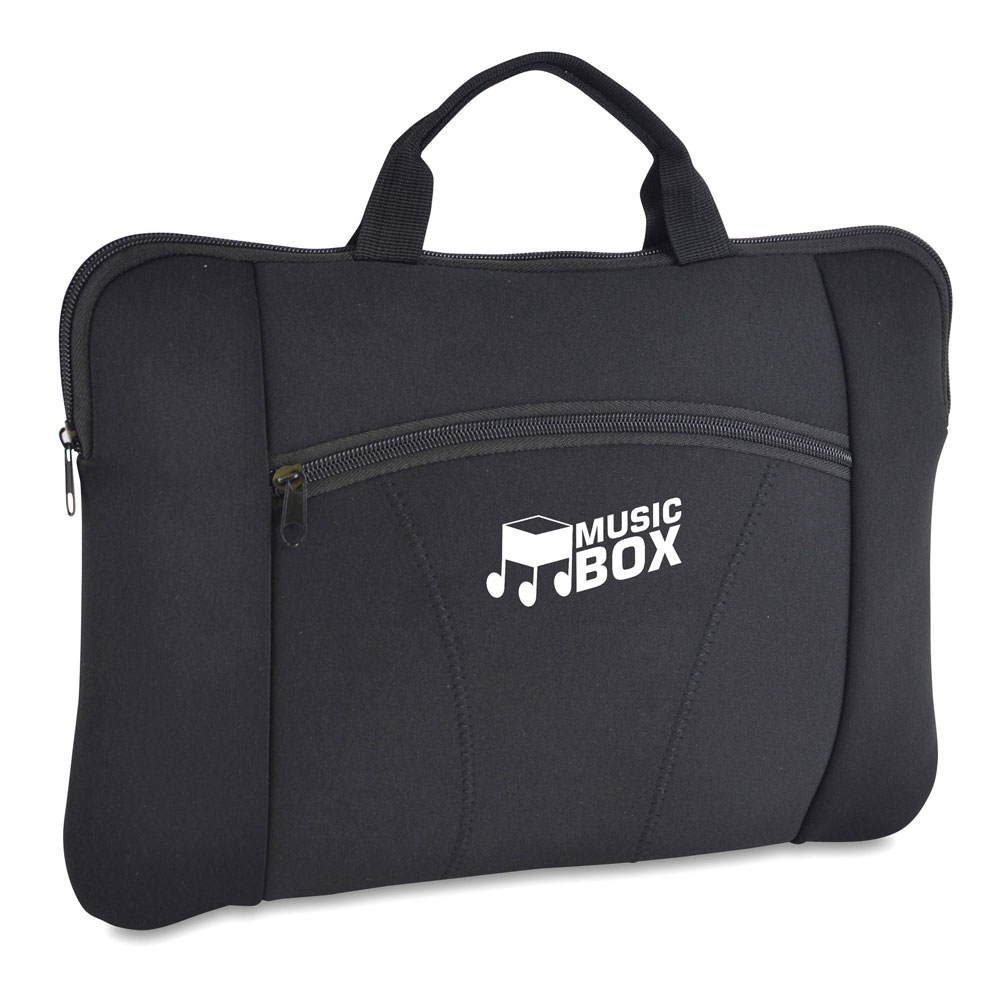 Deluxe, neoprene, zipped laptop sleeve with carry handles and stylish trim, to fit a 15" laptop. Includes front zipped pocket.
