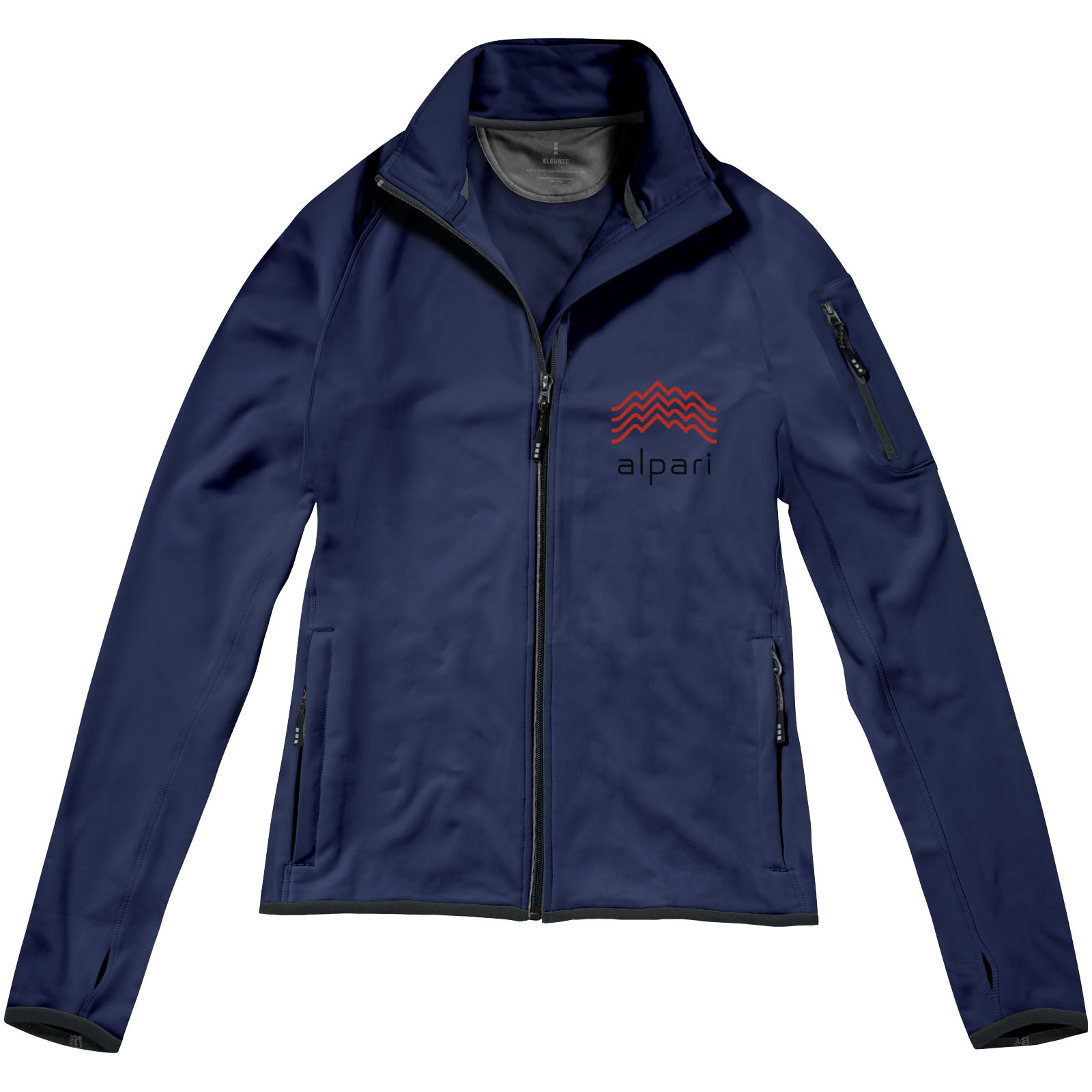 The Mani women's performance full zip fleece jacket – where style meets functionality. Its 4-way stretch fabric ensures unrestricted movement, complemented by thumb holes and reflective details for versatility and visibility. The inner storm flap with chin guard shields against elements. This jacket features elasticated binding on the bottom and sleeves, offering a comfortable and slightly tight fit that adds protection against chilly winds. Made from a 245 g/m² knit of polyester blended with elastane with cool fit finish, this jacket balances comfort and durability. A cool fit finish brings numerous benefits related to moisture management, comfort, temperature regulation, and overall performance. Elevate your activewear with the Mani full zip fleece jacket. This jacket is designed with a fitted shape for a feminine look.