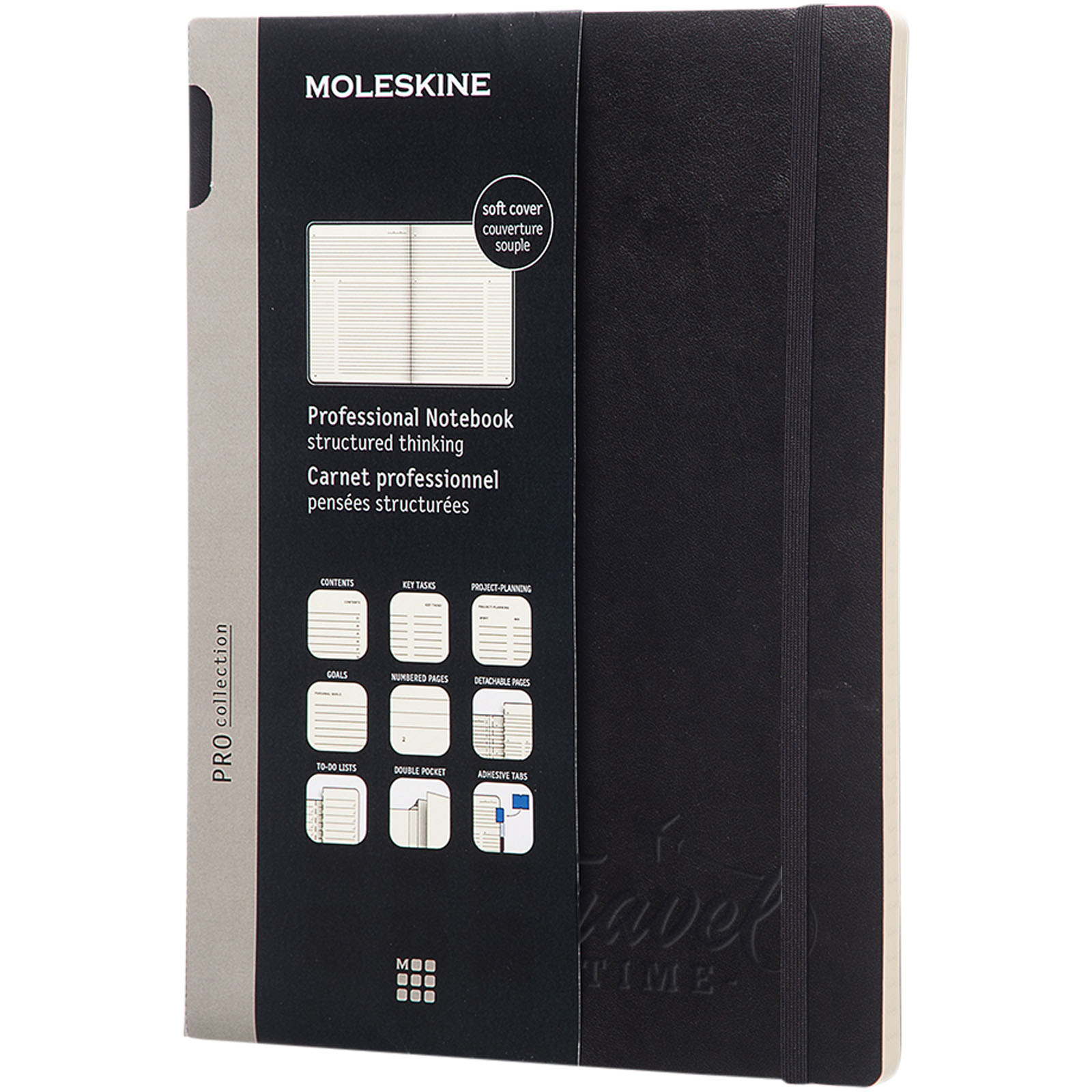 The Moleskine Pro notebook has structured pages, numbered pages and a contents list to help keep track of your notes. Features soft cover rounded corners, ivory-colored, 70 g/m2, acid free paper with color-coordinated bookmark ribbon and elastic closure. Includes front endpaper with 'in case of loss' notice and detachable last 8 pages.