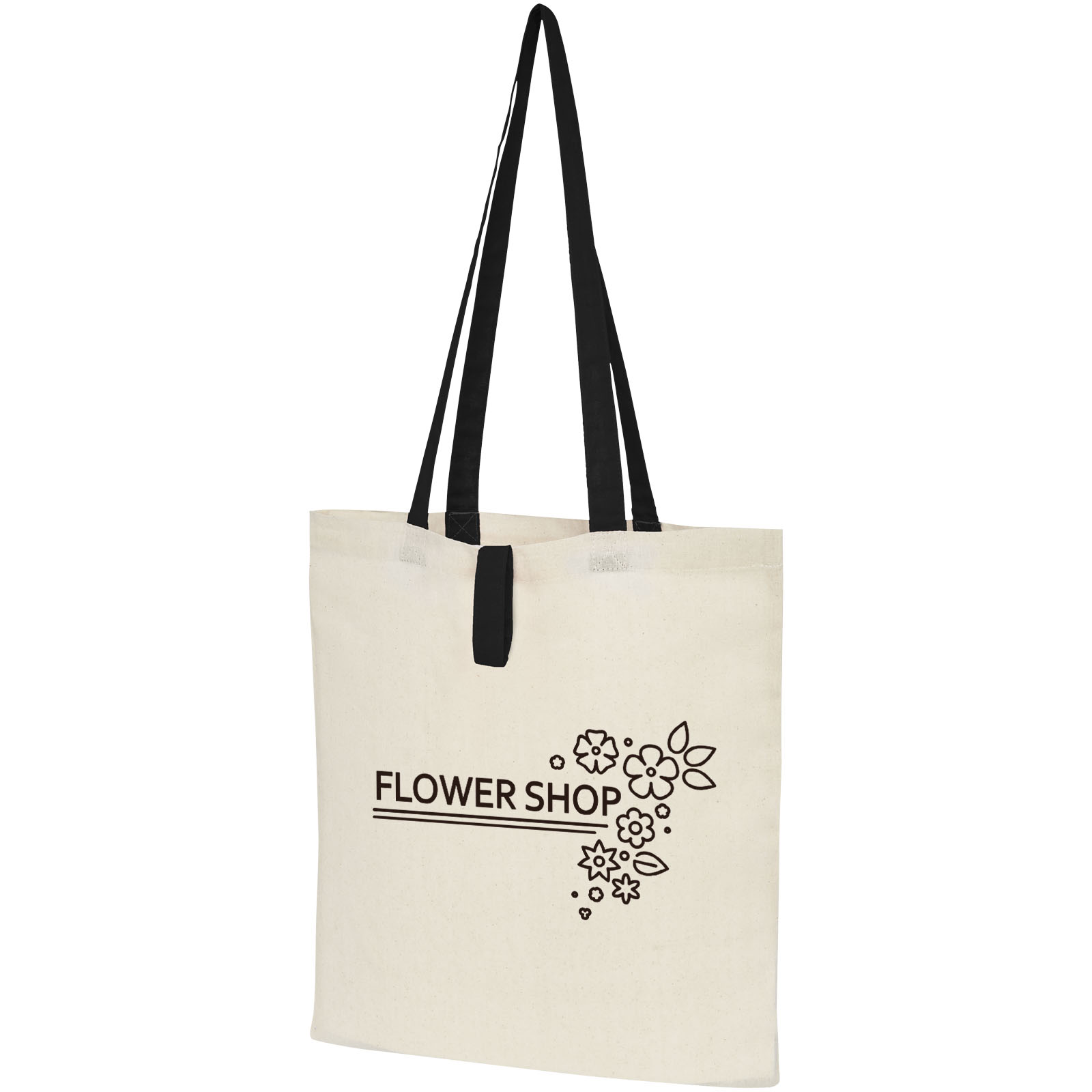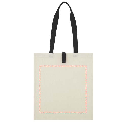Tote bag with an open main compartment and coloured handles with a dropdown height of 32 cm. Features a strap with button closure to keep the bag folded. Resistance up to 8 kg weight.