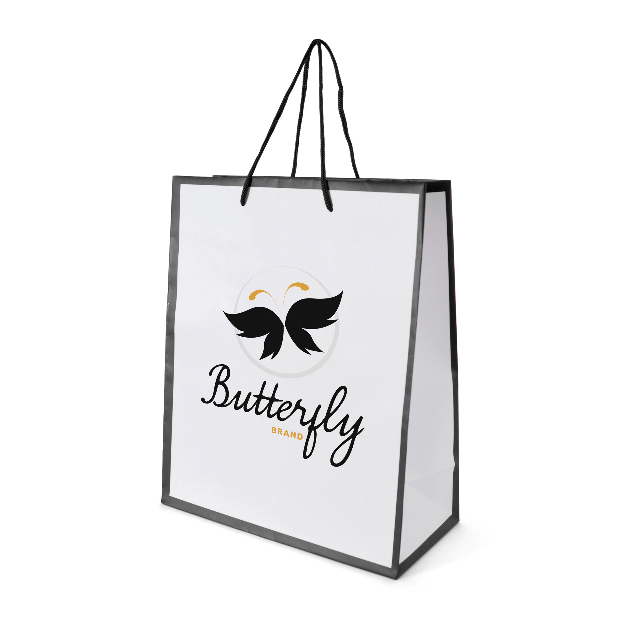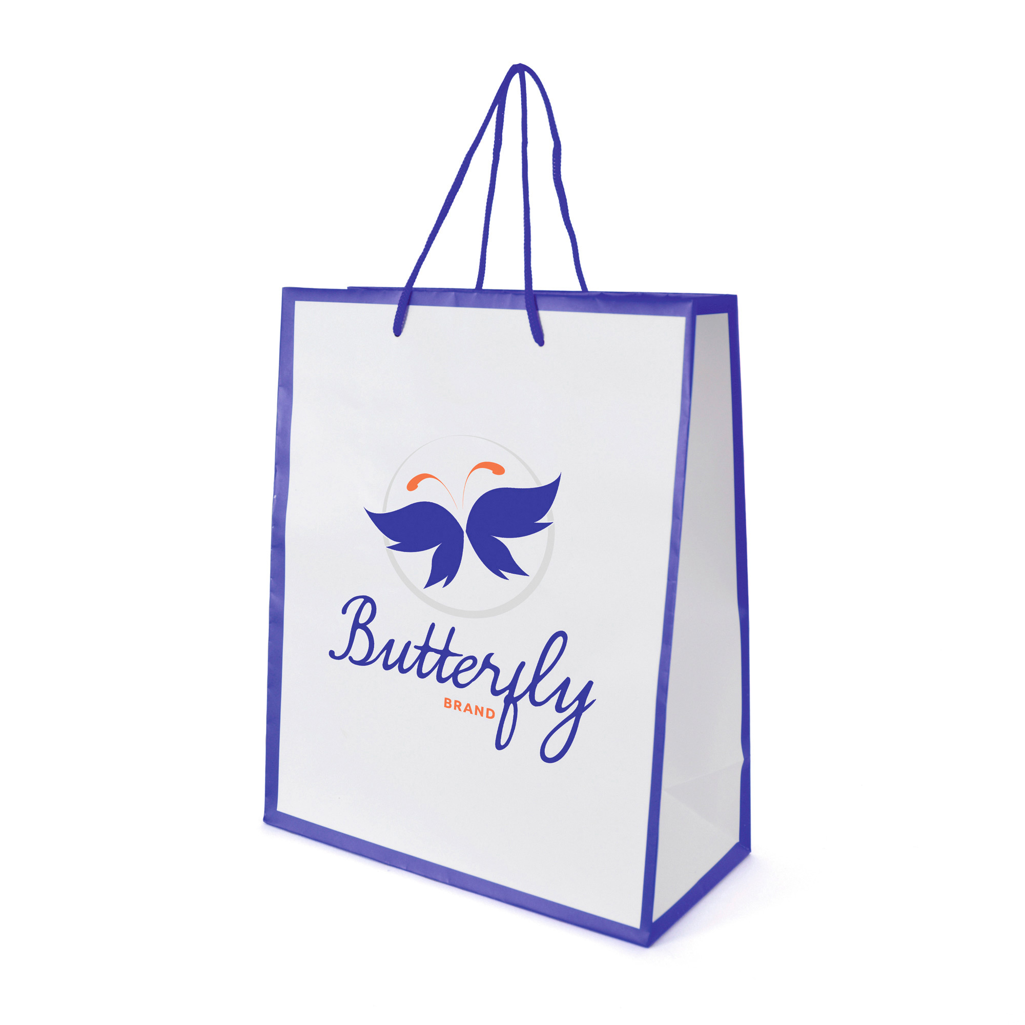 Medium sized white flossy paper bag with coloured trim and rope handles made with 157gsm art paper.
