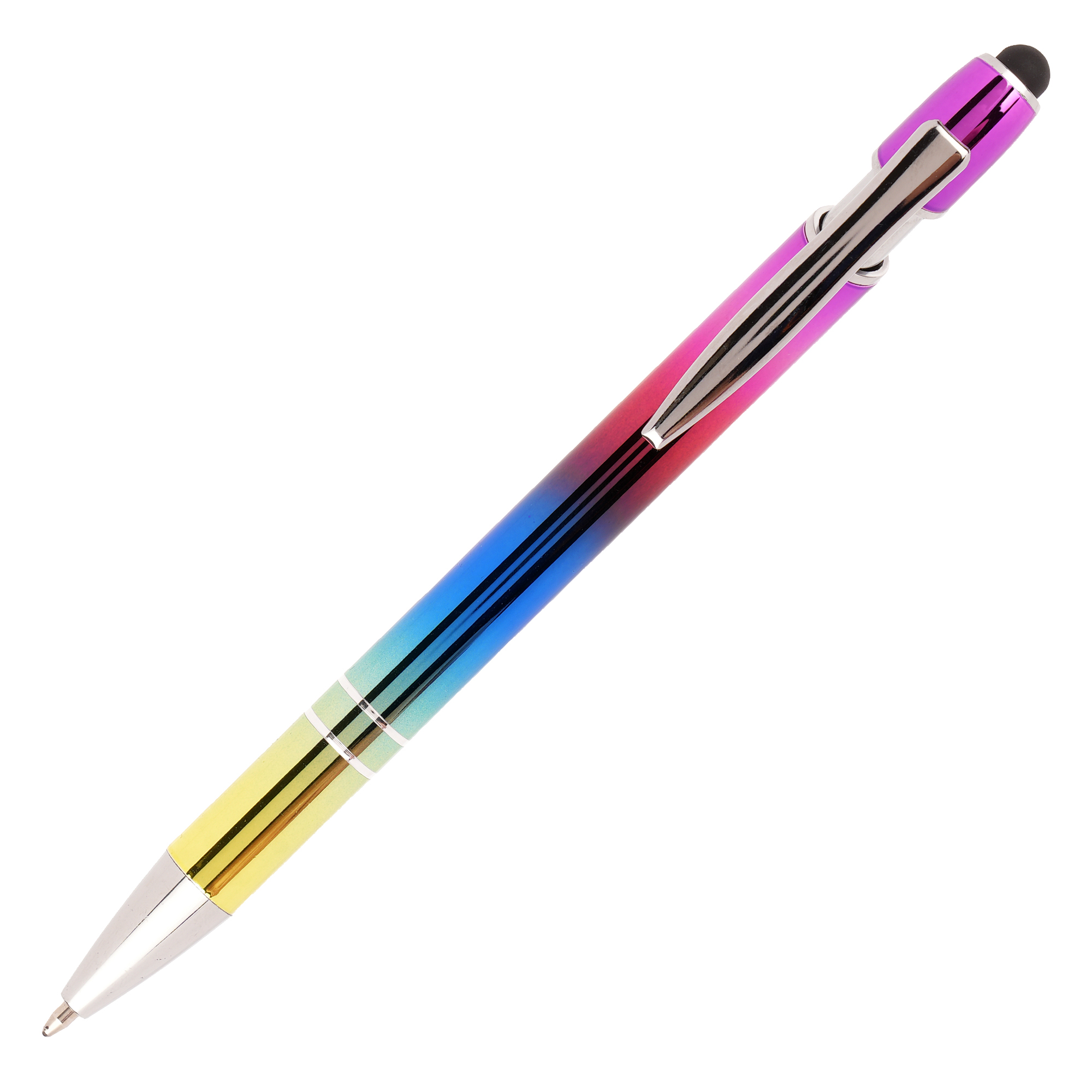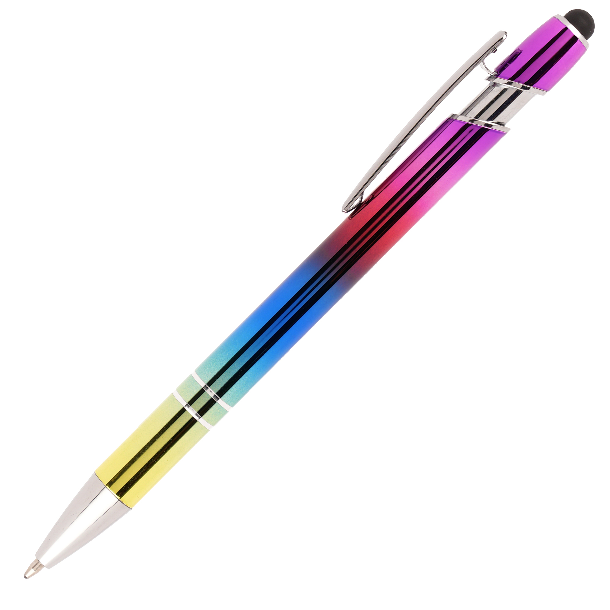 The rainbow version of a much loved best seller! This push action ball pen has a modern design with a useful stylus top. The vibrant rainbow effect produces an eye catching product. Due to the finish marking is engraving only.