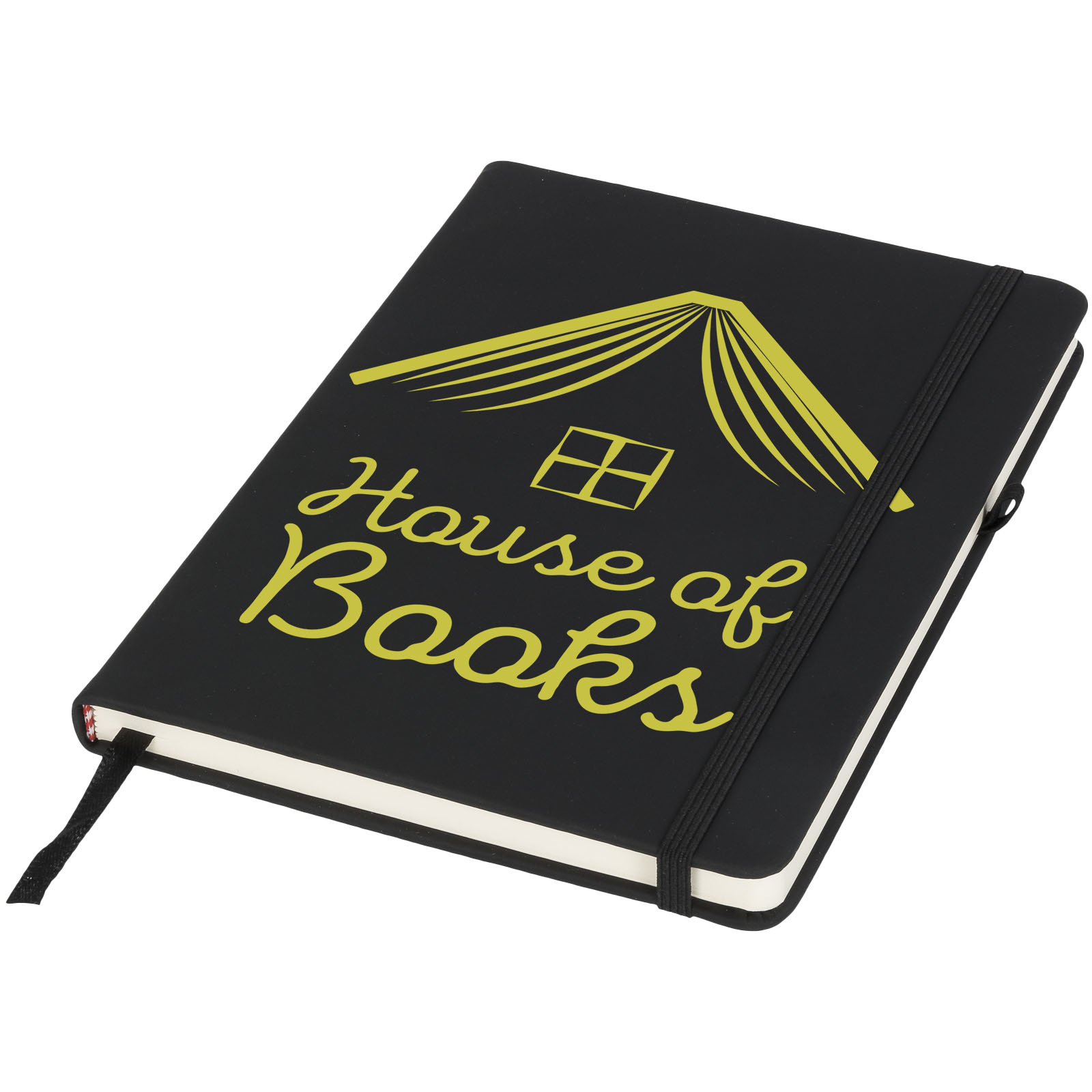 The Noir notebook has a soft-feel black PU cover, for creating a tactile finish to the notebook. Each notebook has a coloured closure strap, pen loop and ribbon page marker. The notebook contains 96 sheets (70g/m2) cream lined paper.