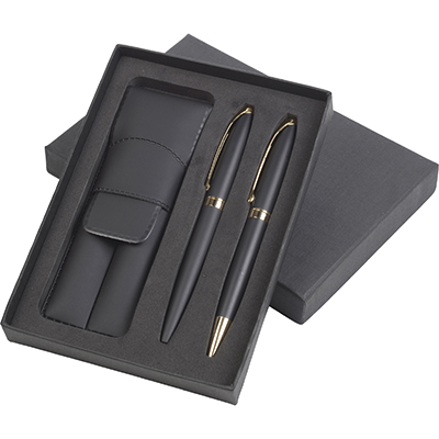 Consort box with pouch containing the Ballad Gold ball pen and roller ball. Prices are based on both writing instruments being personalised with the same design/colour.