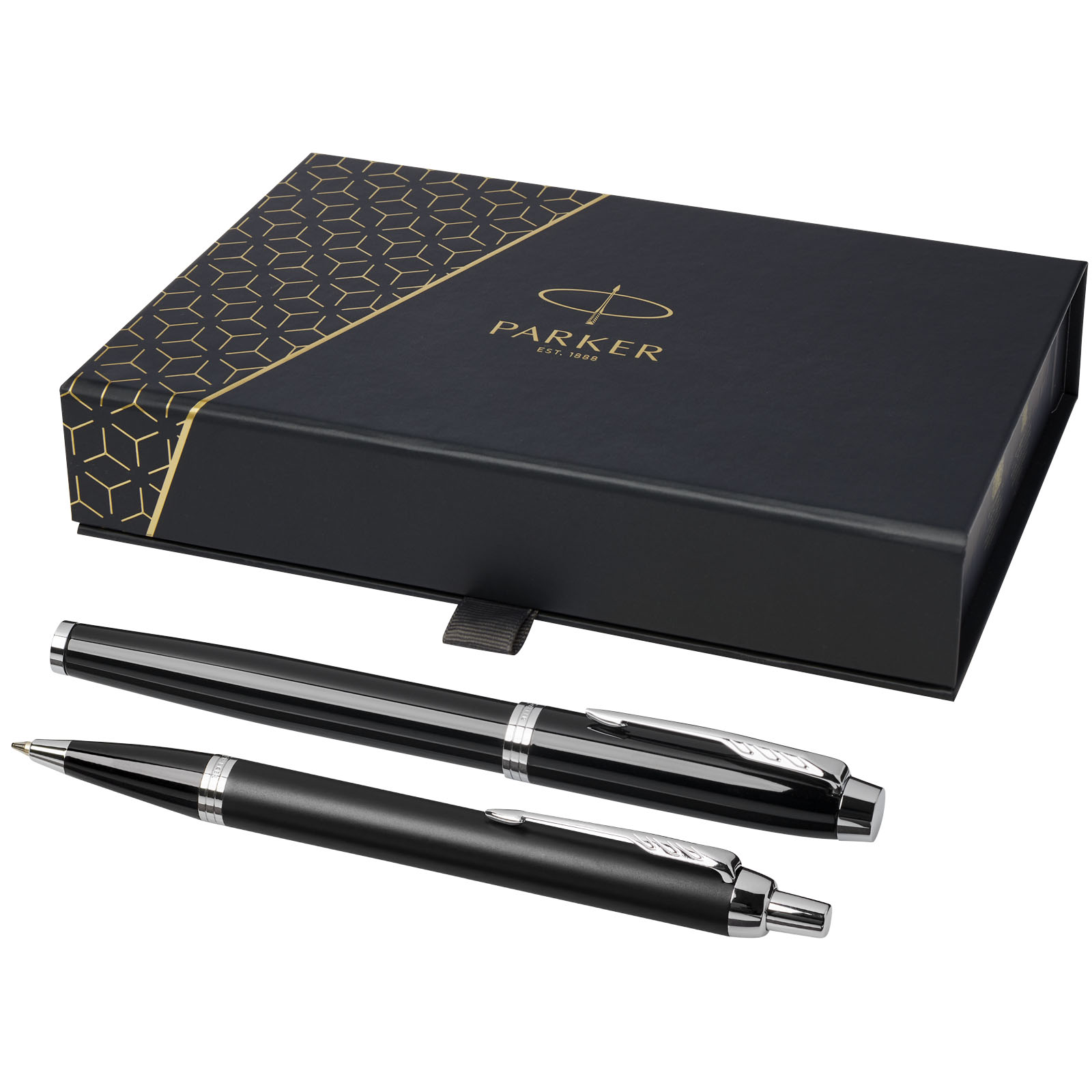 Duo pen gift set consisting of a ballpoint and a fountain pen, both with blue ink. With a contemporary and stylish design, Parker elevates one's style and everyday writing experience above the crowd. Providing good value performance, this everyday premium pen set is a first step into the fine writing category. Exclusive design. Packed in a gift box.