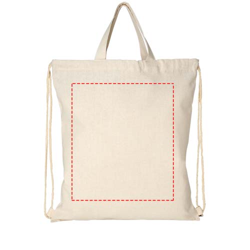 Drawstring backpack made of 210 g/m² recycled cotton polyester blend. Recycled cotton is manufactured from pre-consumer waste generated by textile factories during the cutting process. Large main compartment with cotton drawstring closure. Features two handles with a dropdown height of 14 cm. Resistance up to 5 kg weight. There may be minor variations in the colour of the actual product due to the nature of the production process.