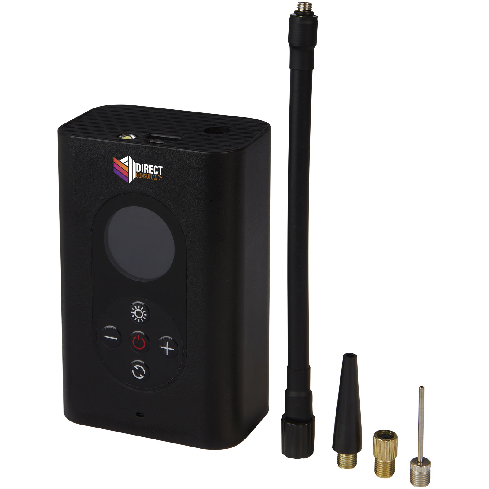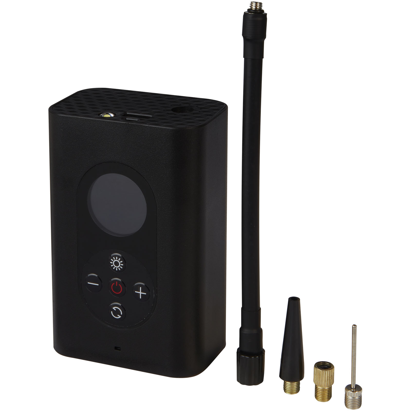 With the Pilot portable air compressor you can inflate car/motorbike tyres or a football or ballon on-the-go. The built-in 4000mAh rechargeable polymer li-on battery provides up to 35 minutes of usage on a single charge. Maximum inflation pressure: 150PSI (990KPA). Features a large LCD screen and 4 preset modes: car, ballon, motorcycle, and ball. Includes accessories to fit the different items. The air compressor can also be used as an emergency power bank with 5V/1A output. It takes approximately 3 hours to charge the compressor from 0% to 100%. Comes with a pouch for easy transport and storage. Delivered in a Tekiō premium kraft paper box with a colourful sticker.