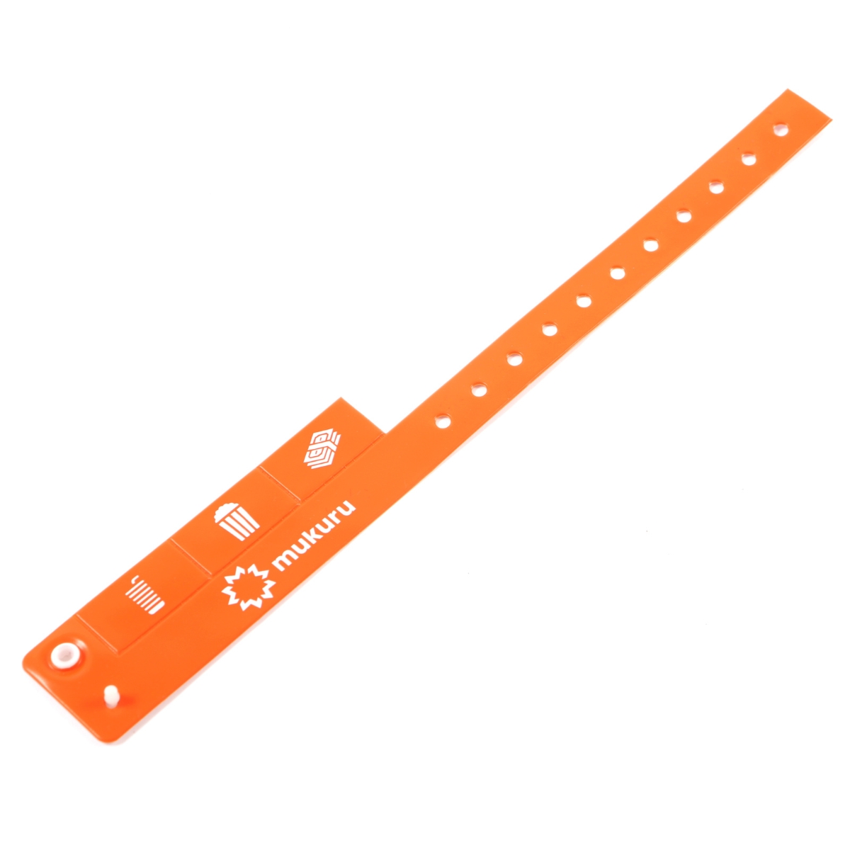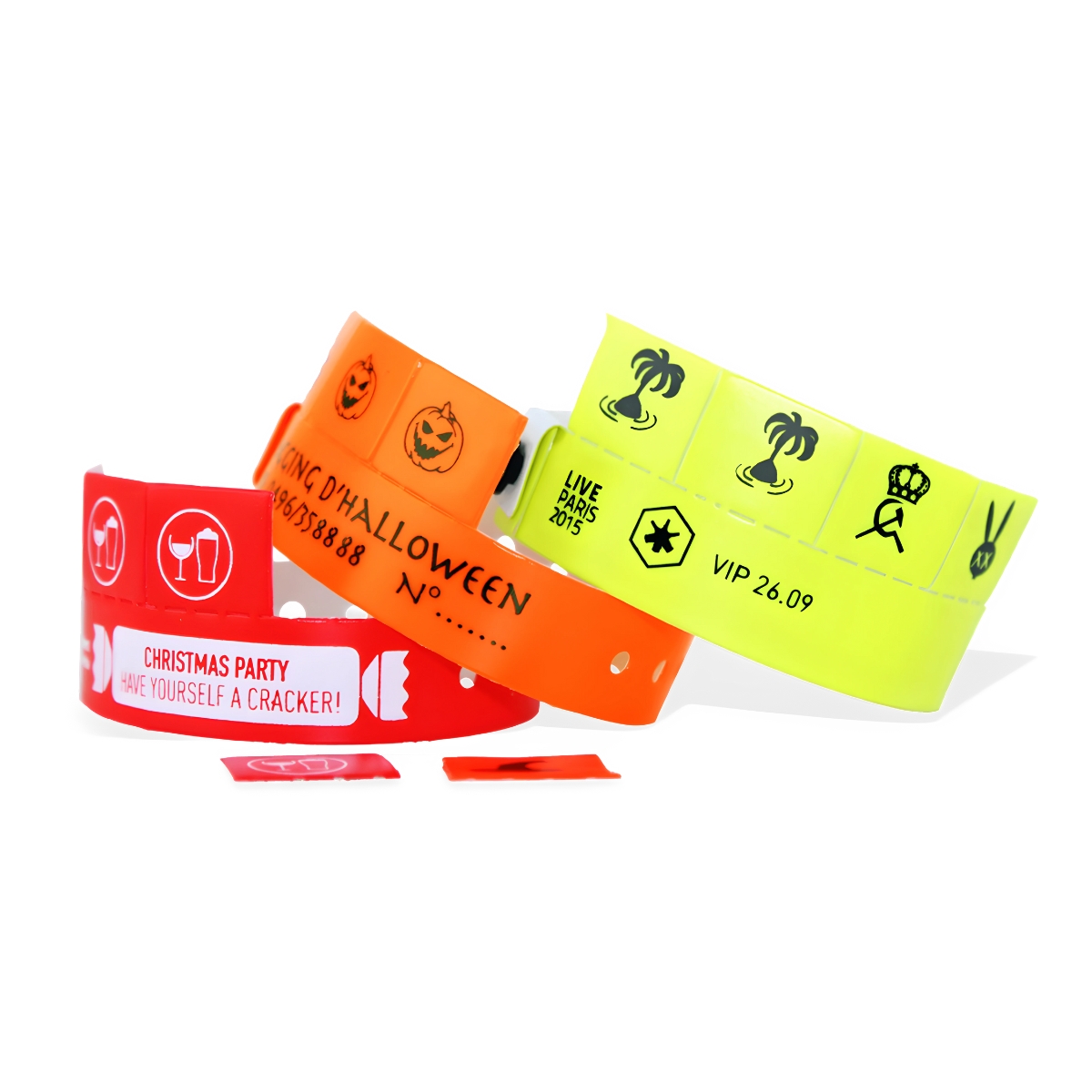 Our Printed Vinyl Tab Wristbands with detachable tabs are designed to easily track amenities such as ride usage, drink tickets, meal vouchers, and more. These wristbands are ideal for extended events at festivals, nightclubs, bars, pools, and other venues. Simply tear off a vinyl tab from the wristband to distribute items. Our wristbands are highly secure and non-transferable.